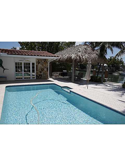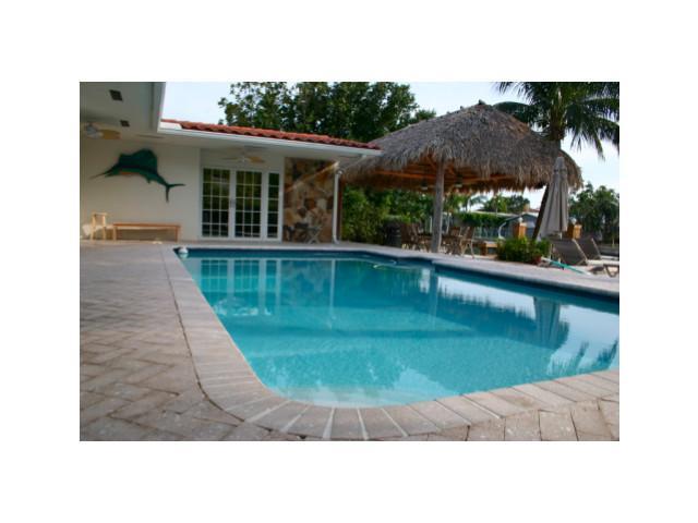 This spacious waterfront home is elegant inside and out with abundance of light streaming through French doors and windows Three bedrooms, three baths plus an office with custom crafted built-in cabinets, living room, formal dining room, spacious kitchen, pantry, utility-laundry room with floor to ceiling storage cabinets. Indulge in a lushly landscaped paved front and backyard with pool, tikki hut, new dock on 75' of the widest part of the canal with no fixed bridges. Five min boat ride to the ocean.