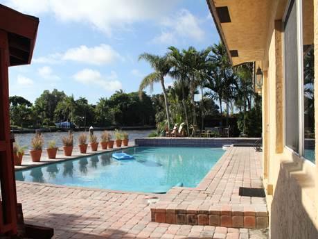 Point lot Spanish style 3/3 home w/dock, 98 ft on Middle River & 150 ft to distant house across water bounding w/ fish, manatees. Ocean access w/1 fixed bridge being raised NOW. Giant solar heated pool, spa. All bedrooms and living room with French doors east water view and pool. Huge raised ceiling in open living/dining with terracotta tile;stainless steel appls. Quiet, private fenced hideaway, 15 ft ficus hedge surrounding, yet close walk to all and minutes to dwtn, hwys. Renovated 1994; plans available