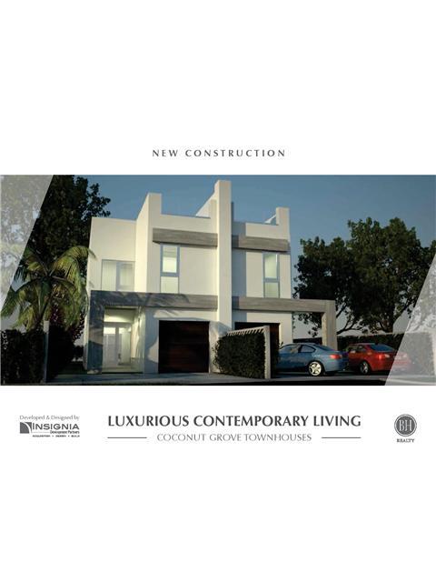 NEW CONSTRUCTION! Luxurious Contemporary Living Coconut Grove Townhouse! HIgh-grade designer finishes and open floor plan. This 3 bedroom, 3 bathroom, 1 car garage and 2 guest parking spaces has ultra-modern fixtures and floor-to-ceiling impact glass. Pri vate rooftop terrace with beautiful views of lush, tropical neighborhood. 2,300 Sq Ft plus a 950 Sq Ft Roof Terrace.