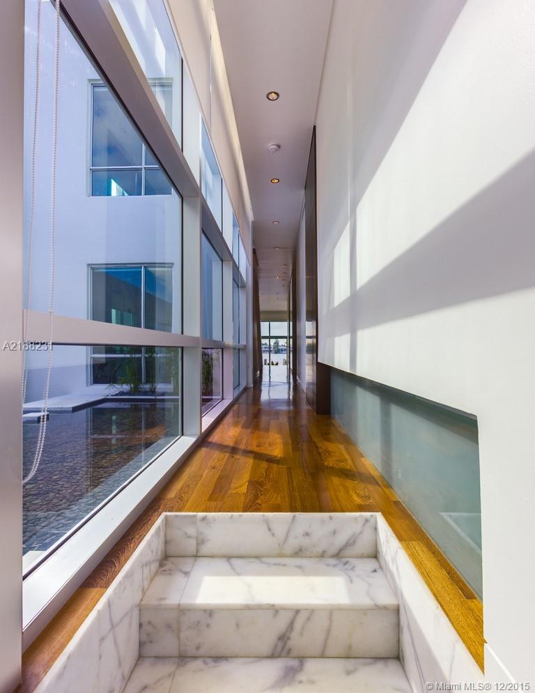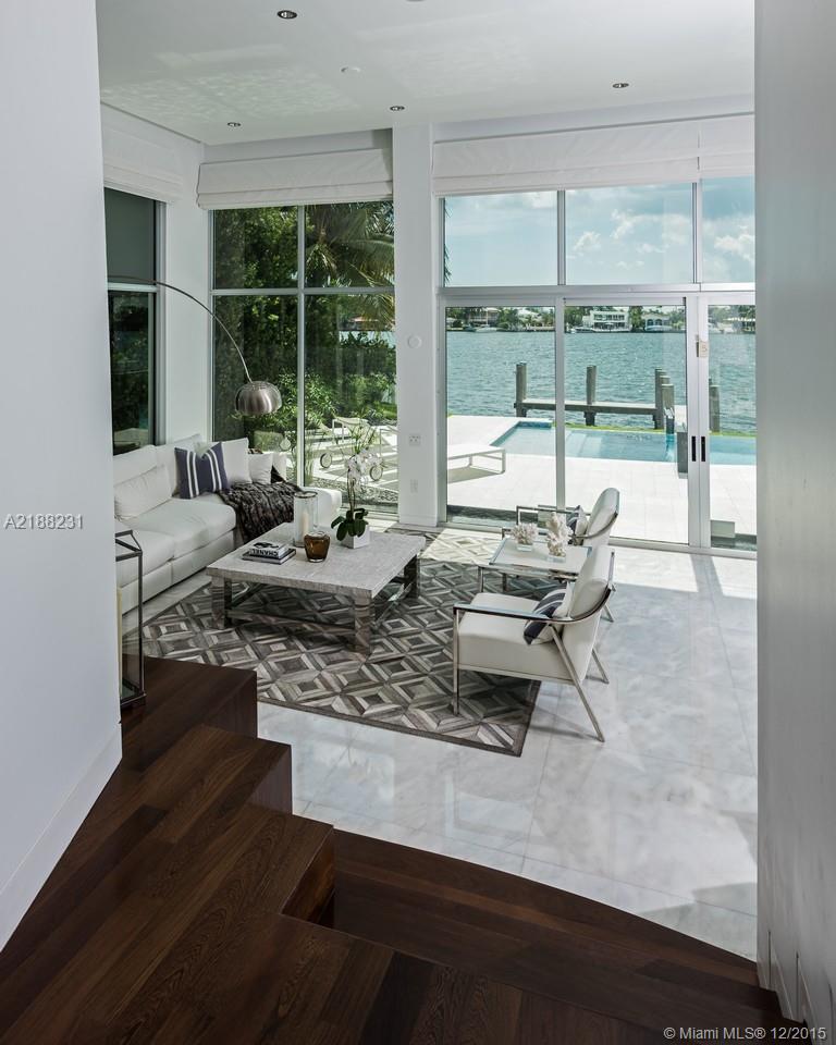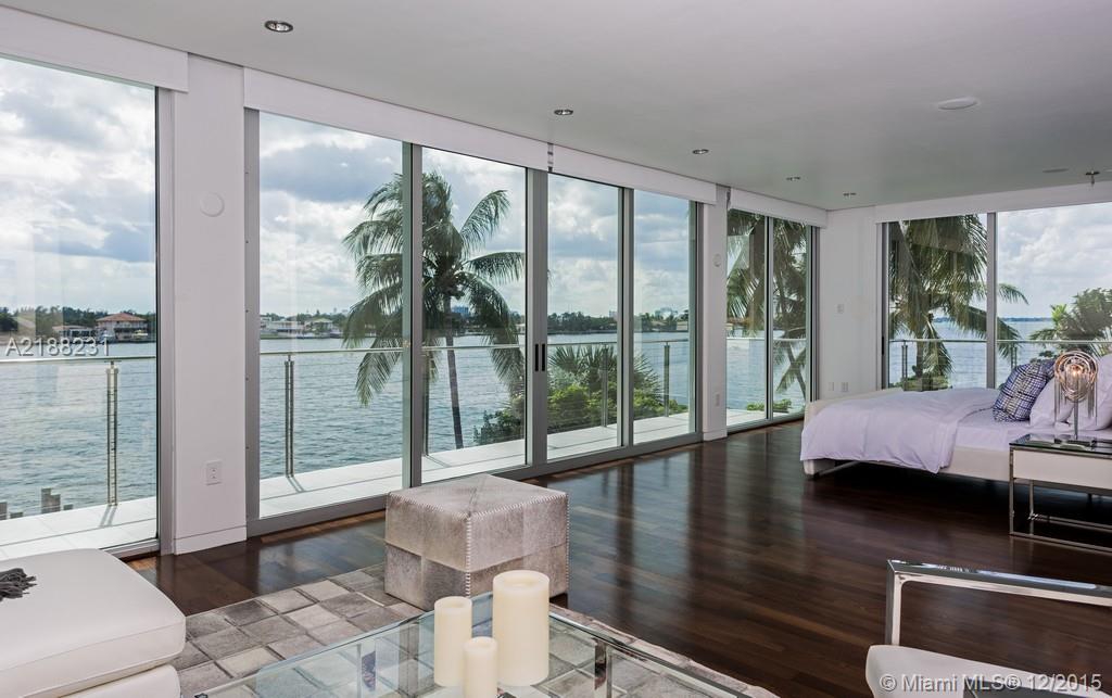 Serene Isle of Biscaya. Contemporary smart waterfront home, offers light filled living spaces surrounded by soaring glass walls & fountains, hovering over the wide bay, creating a sensory filled living environment. State of the art finishes and a great fl oor plan including, 5 bedrooms 5 baths upstairs, with a 1,200 s/f master suite. Dock, pool, 2 car garage plus room for lifts, 2 bedroom suites downstairs, eat in kitchen, family room, office, formal living and dining and more.