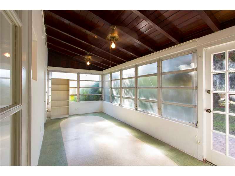 Truly a jewel to be polished, this charming home has wonderful space distribution & lush yard full of potential. Hardwood floors, large windows, distinctive molding & built-in nooks/shelves, original French doors. Sun porch/family room w/ unique oval patt ern terrazzo floor. Eat-in kitchen w/semi-circular breakfast nook. 2 beds w/ cedar closets. Newer red brick walk & driveway. Large linen closet, accordion shutters & termite warranty. 2/1 + 1/1 garage conversion. Great price to make this home shine again!