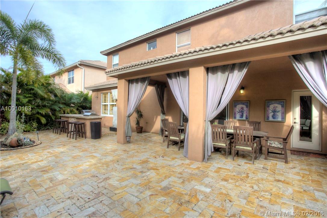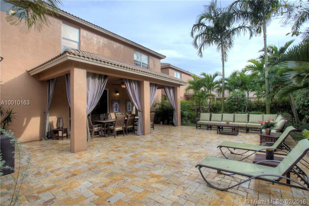 Beautiful home in the desirable Isles at Weston with a fabulous layout. Entertain beneath soaring in this resort style patio! A well-appointed kitchen with special design Bronze Jenn-Air, double ovens, microwave, dishwasher, refrigerator & hood. Quartz counter tops with glass tile backsplash that will take your breath away! Crown molding, ceramic tile 1st floor, wood floors in the stairs and 2nd floor. Don't wait a must see, act now before is gone!