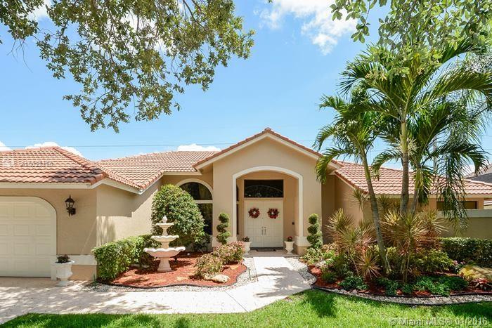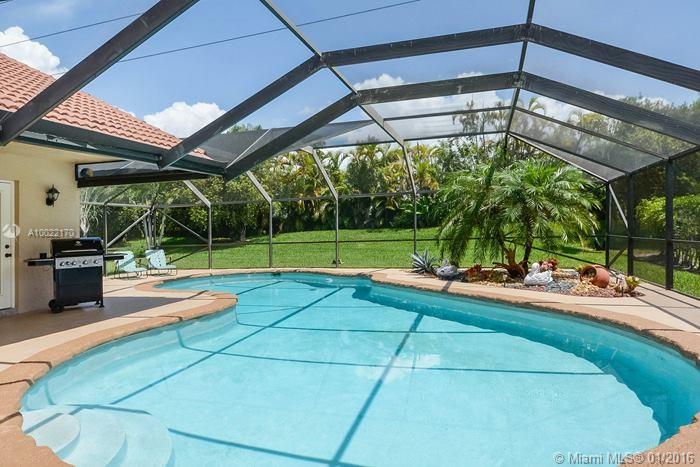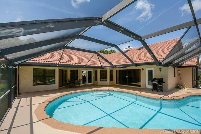Drive the tree lined streets in this boutique community of Tequesta Manor homes to arrive at this one story, 5 bedroom, 3 bath home with screened in pool for entertaining. 22" Diagonal Tile and wood floors in office. Impact glass Skylights, crown moldings and high end décor throughout. Upgraded Kitchen features maple wood cabinets, granite counters and stainless appliance with NEW refrigerator and pull out pantry. Gated Weston community with "A" rated schools. Close to shopping, dining & Peace Mound park.