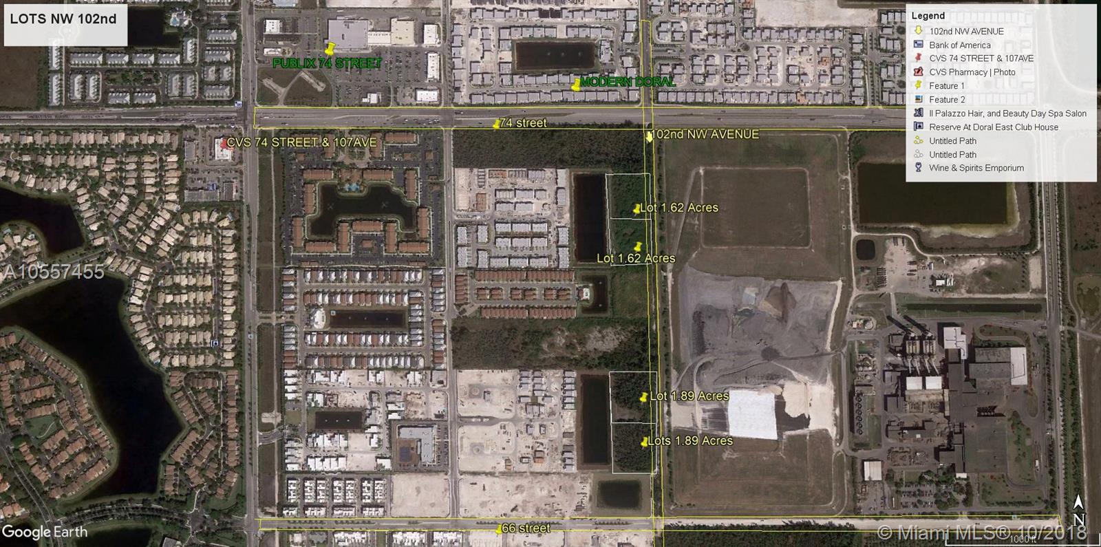 *** LOCATION * LOCATION * LOCATION *** 655 feet fronting the 102nd nw avenue, between the 74th street and the 66th street in the most developed area in DORAL one of the cities It is approved by the city a nucleus plan of 4 traffic lights, at the intersection of 102nd ave and 74 street, which will make the 102nd Ave in high traffic traffic.This property is made up of 2 pages, 35 -30-17-001-0180 with Zoning IC & 35-30-17-001-0190 Zoning Pending,master plan GU, Recommended , CC, which could lead to develop up to 200,000 sqft. with a maximum height of 6 floors, with various uses, professional uses, medical offices, restaurants, educational , trade school, religious facilities, Day Care, Show Rooms, Montion Picture Production Studios, BARS, Nogth Clubs, Wine Cafes, BANKS, AND GENERAL RETAILS.