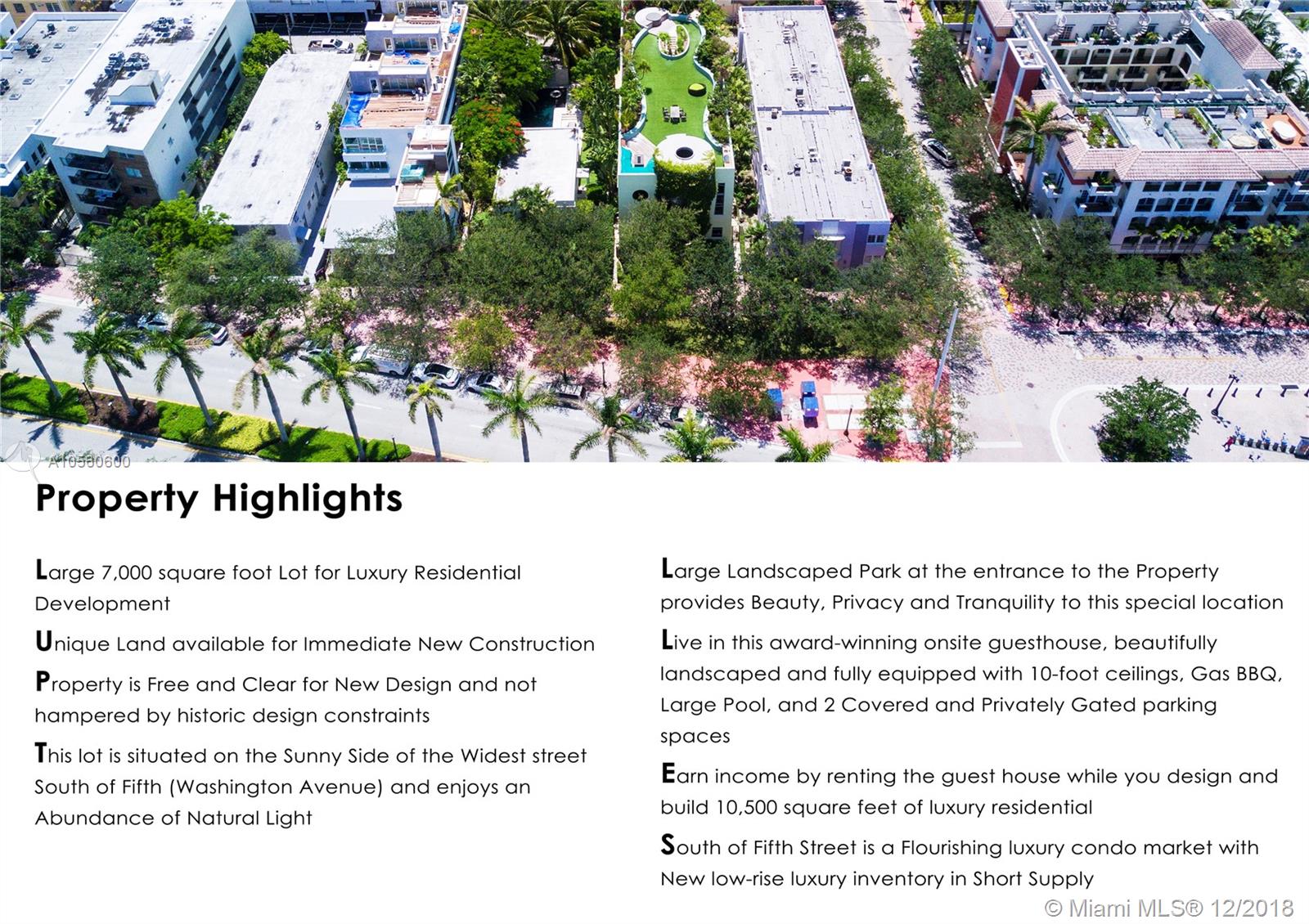 Large 7,000SF South of Fifth Lot for Luxury Residential Development. Unique Land available for Immediate New Construction. Free & Clear for New Design, not hampered by historic design constraints. Earn $150,000/yr guaranteed guest house income while permitting 10,500SF of Luxury Residential. Large Pool & 2 Covered Privately Gated parking spaces. Sunny Side of the widest street South of Fifth (Washington Ave), insulated by a beautifully landscaped park. One of the most Exclusive & Desirable neighborhoods in the world! Surrounded by high-end Condominiums $2-$5MM, $1200-$1500/SF. Most popular stretch of Sandy Beach, Boating Lifestyle w/ Miami Beach Marina a short stroll away. Walk to Miami Beach's best restaurants incl Joe’s Stone Crab, Milos, Prime Italian & Fish, Il Mulino, & so many more.