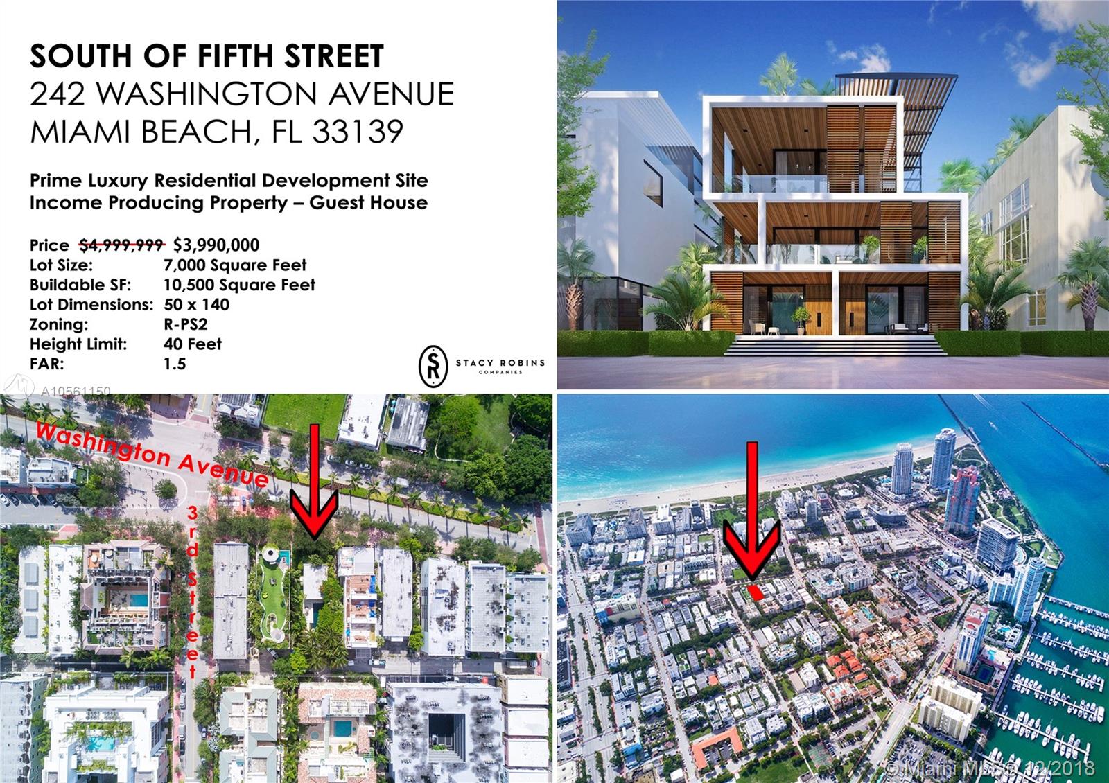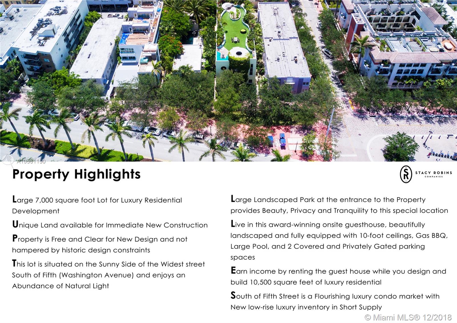 Large 7,000SF South of Fifth Lot for Luxury Residential Development. Unique Land available for Immediate New Construction. Free & Clear for New Design, not hampered by historic design constraints. Earn $150,000/yr guaranteed Guest House Income while permitting 10,500SF of Luxury Residential. Large Pool & 2 Covered Privately Gated parking spaces. Sunny Side of the widest street South of Fifth (Washington Ave), insulated by a beautifully landscaped park. One of the most Exclusive & Desirable neighborhoods in the world! Surrounded by high-end Condominiums $2-$5MM, $1200-$1500/SF. Most popular stretch of Sandy Beach, Boating Lifestyle w/ Miami Beach Marina a short stroll away. Walk to Miami Beach's best restaurants incl Joe’s Stone Crab, Milos, Prime Italian & Fish, Il Mulino, & so many more.