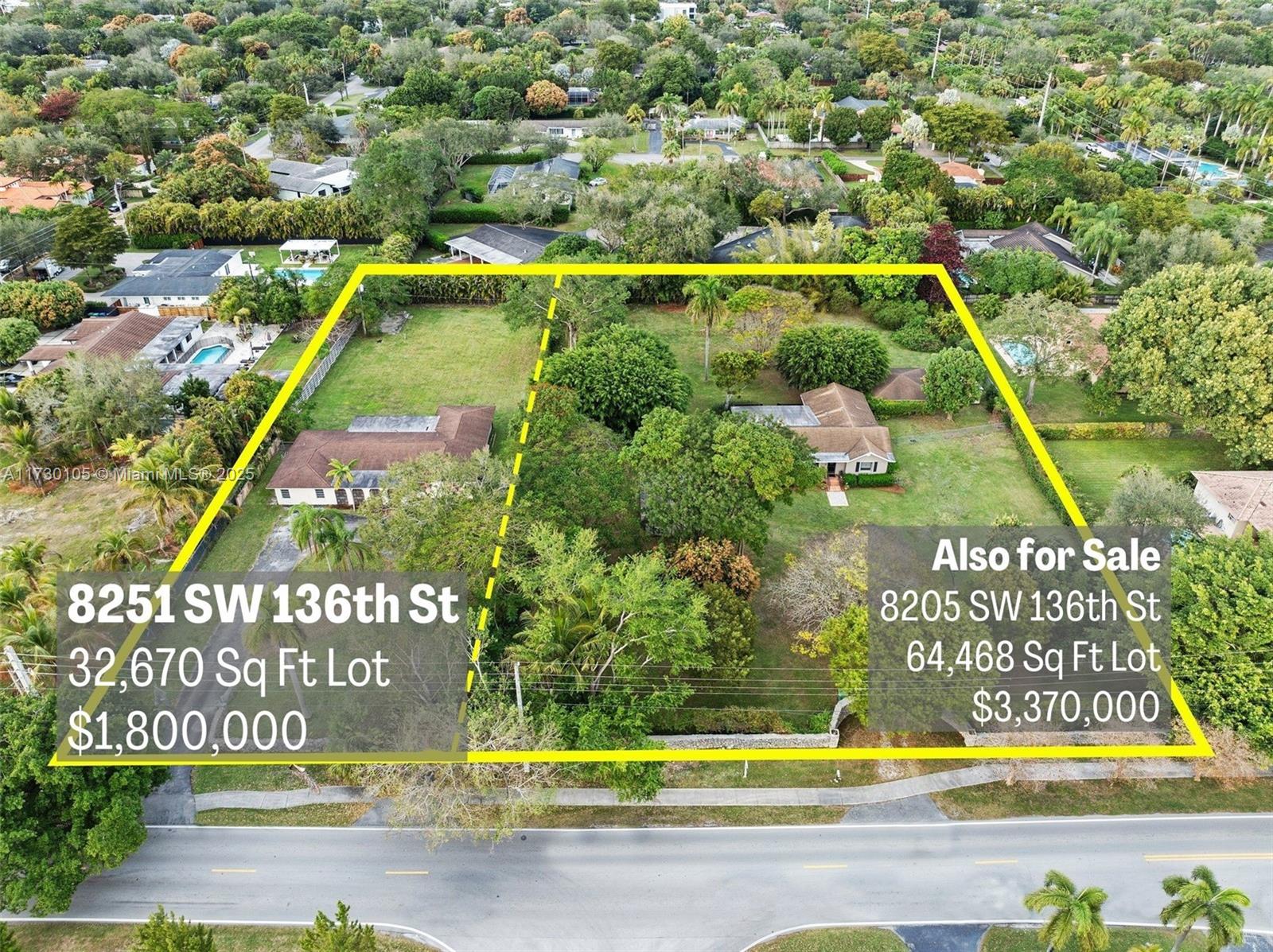 Pinecrest 32,670 Sq. Ft. Land Sale. This 3/4-acre property at 8251 SW 136th St has a 4BD/2BA house occupied by a month-to-month tenant. The adjacent 64,468 Sq. Ft. property is also for sale (MLS#A11585662), at 8205 SW 136th St, with an owner-occupied home. Buy one or both lots to develop or lease, and fulfill your Pinecrest real estate dreams! This combined, sprawling 97,138 Sq. Ft. canvas is a rare opportunity in the highly coveted Village of Pinecrest. The community is a showcase of beautiful homes and parks, top-rated schools, and a buzz-worthy dining and shopping scene, with a network of lakes and canals that deliver intrepid kayakers all the way to the bay’s edge. Just 2 minutes from US1, the property has easy connectivity to the rest of Miami and beyond.