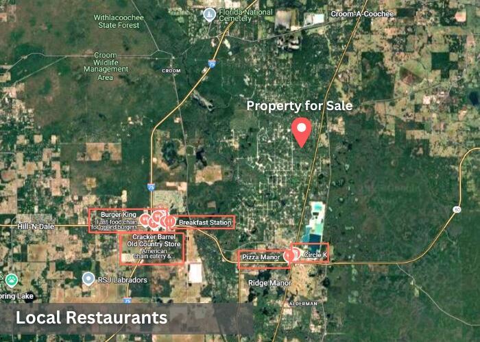 This easily accessible 1.16-acre undeveloped lot is located in the non-HOA subdivision of Ridge Manor Estates. The heavily wooded parcel is ideal for those seeking recreational or residential land outside city limits, with direct access via a road. The property is zoned R1C and includes 20% wetland and 30% flood zone. Single-family dwellings and short-term rentals are permitted, but camping, mobile homes, and RVs are not allowed according to county regulations. Access the property through Wishing Stone Dr., which is a dirt county road. According to the Hernando County Utilities Department, well and septic systems are required. Power poles are visible along the access road. Nearby attractions include Giraffe Ranch and Walt Disney Resort.