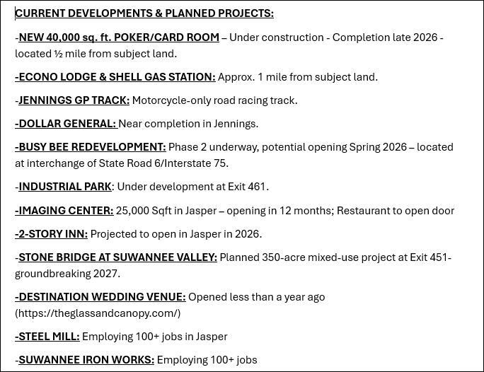 Rare 40.55-acre tract in Jennings, Hamilton County, FL just off Exit 467 (SR 143), the first Florida exit southbound on I-75 from Georgia. Fronts CR 143 with paved access, only 3/4 mile from I-75 and 4 miles south of the GA line. Preliminary data suggests traffic at Exit 467 averages 40,000 vehicles/day (FDOT confirmation pending). A new 40,000 sq. ft. Poker/Card Room is under construction nearby (est. completion 2026). Area growth includes an Industrial Park at Exit 461, the planned 350-acre Stone Bridge mixed-use project at Exit 451 (2027), and Suwannee Iron Works relocating 100+ jobs. Zoned AG-4 (1 house/5 acres) with strong potential for rezoning, with additional adjacent land potentially available.
