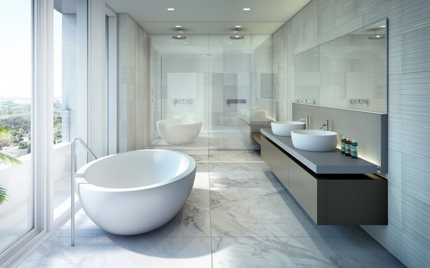 Baños en cada residencia de Beach House 8 contarán con el doble techo, cabezas de ducha de pared en cada baño principal, sustanciales losas de travertino italiano-cantera, mármol de Carrara, las superficies de piedra para suelos, paredes y encimeras, Boffi, Duravit y Dornbracht gabinetes y accesorios.