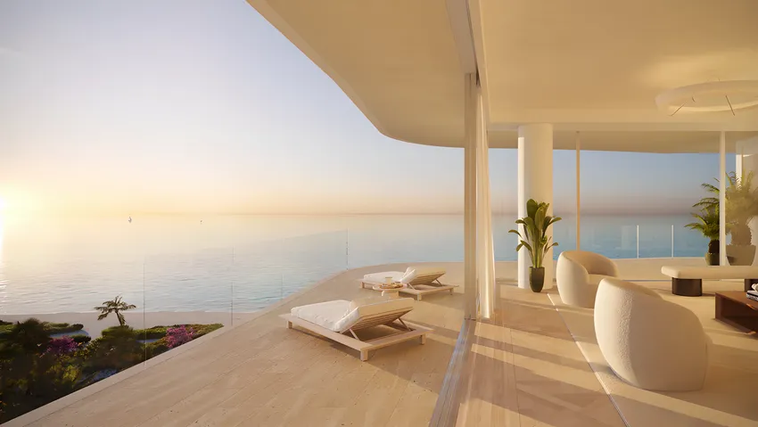 Los espacios amplios y llenos de luz cuentan con ventanales panorámicos y techos de hasta 3.35 m (11 pies), mientras que las profundas terrazas de formas orgánicas, con vistas al océano, amplían la vida interior hacia el horizonte.