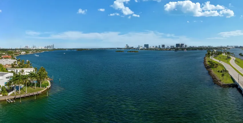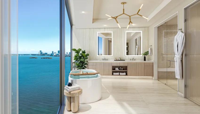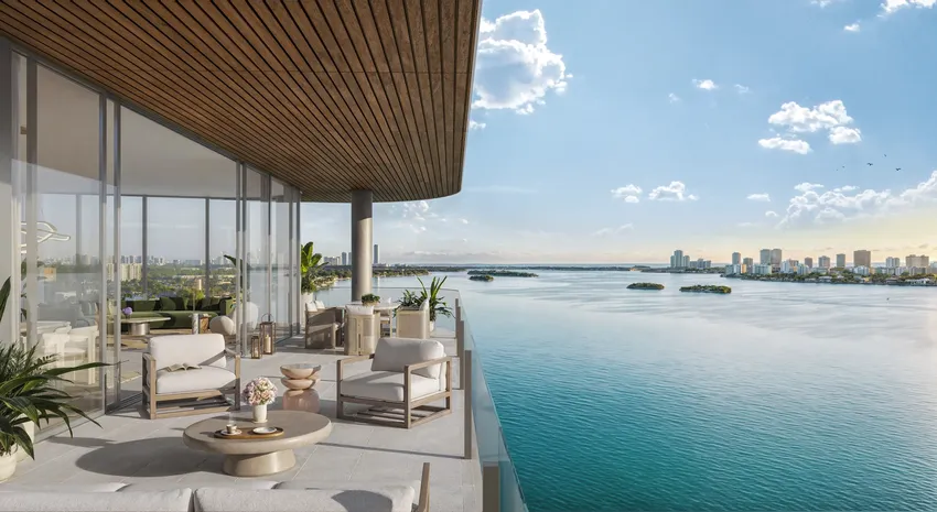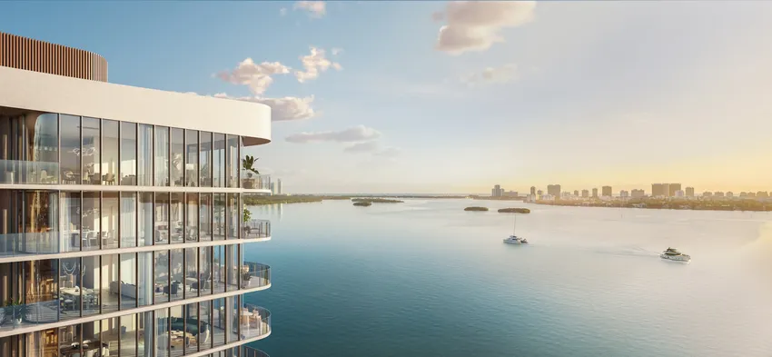 - Cuatrocientos cincuenta pies lineales de paseo marítimo privado, incluidas vistas de 290 grados de la costa de Miami, gracias al cristal curvado integrado en el sistema de paredes de las ventanas