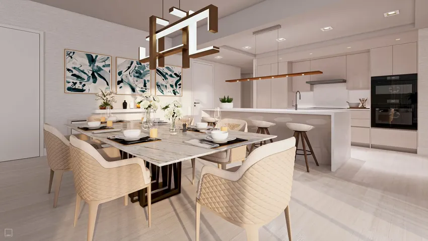 - Concepto residencial de planta abierta que incluye áreas de estar, cocina y comedor