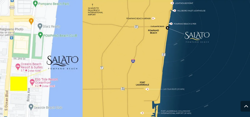 Idealmente ubicado entre Boca Ratón y Fort Lauderdale, Pompano Beach es un lugar único que aún no ha perdido su encanto en la costa del sur de Florida. El condominio en Miami a la venta Salato Residences se encuentra en la intersección de Briny Ave y Southeast 4th St., a solo pasos del muelle de Pompano, con acceso directo a la mejor playa de la ciudad.
