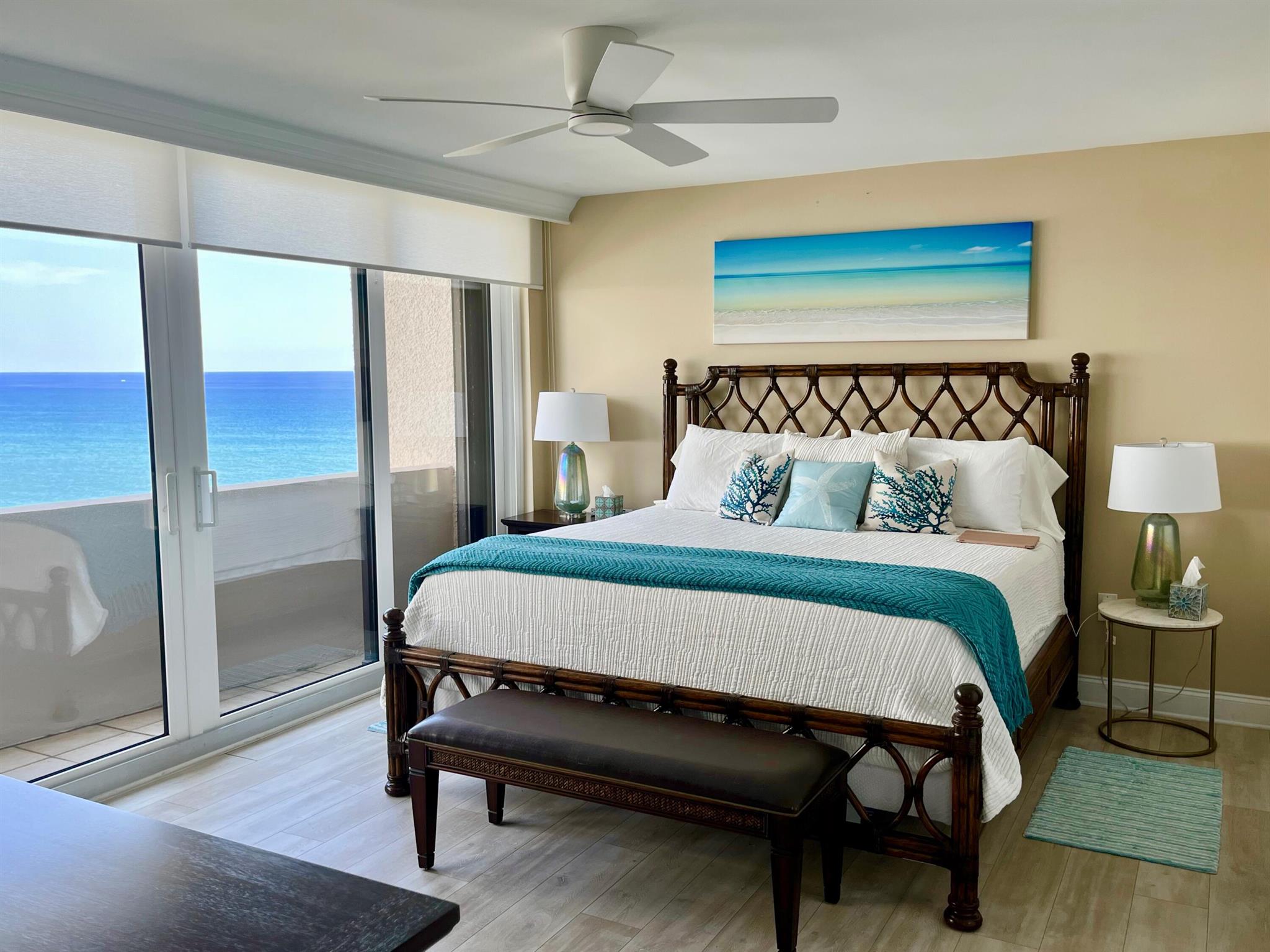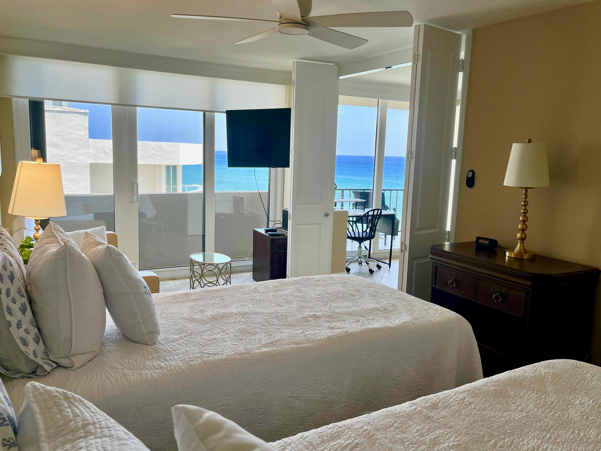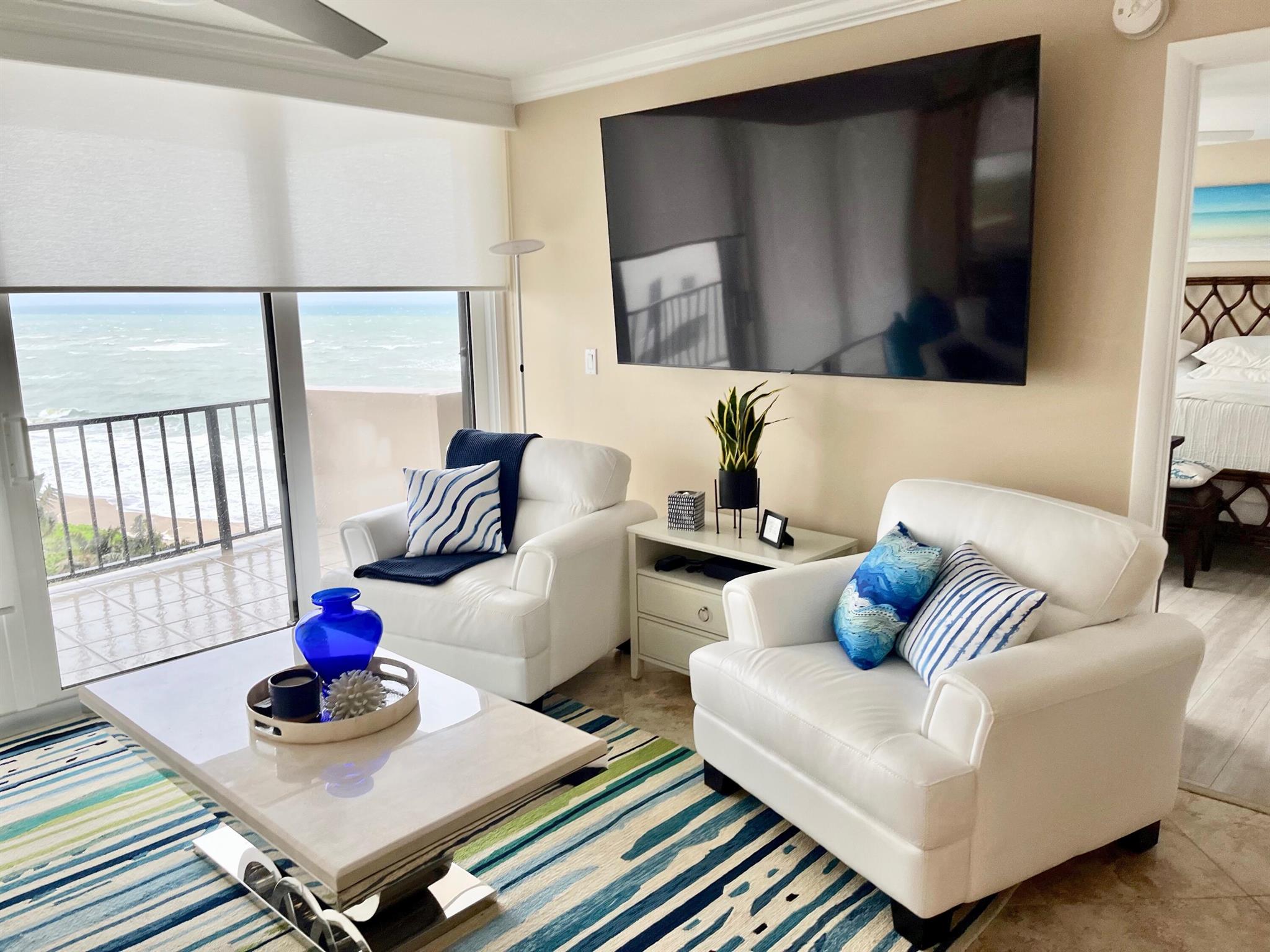 OCEANFRONT ''A'' TOWER - every room has an ocean/Intracoastal view! TOTAL remodel w smooth ceilings, IMPACT glass, decorator shades, recessed lighting, fans w remotes. New wood look flooring in bedrooms. Kitchen + bathrooms updated w granite, new mirrors & crown molding. King Bed in primary suite & 2 twin beds in guest BR + Queen Sleeper Sofa. BOSCH A/C & washer/dryer in the interior laundry room. Enjoy ocean beachfront living at its best! Heated pool on elevated deck between Towers, fitness, tennis courts + private walkover to ocean. Assigned parking #60 close to entry door. Electric to be subtracted from security deposit. Includes Beach Chair Club Service (2 chairs + 1 table). Non-Smoking Condo, no pets allowed. RENTED JAN-MAR 2026