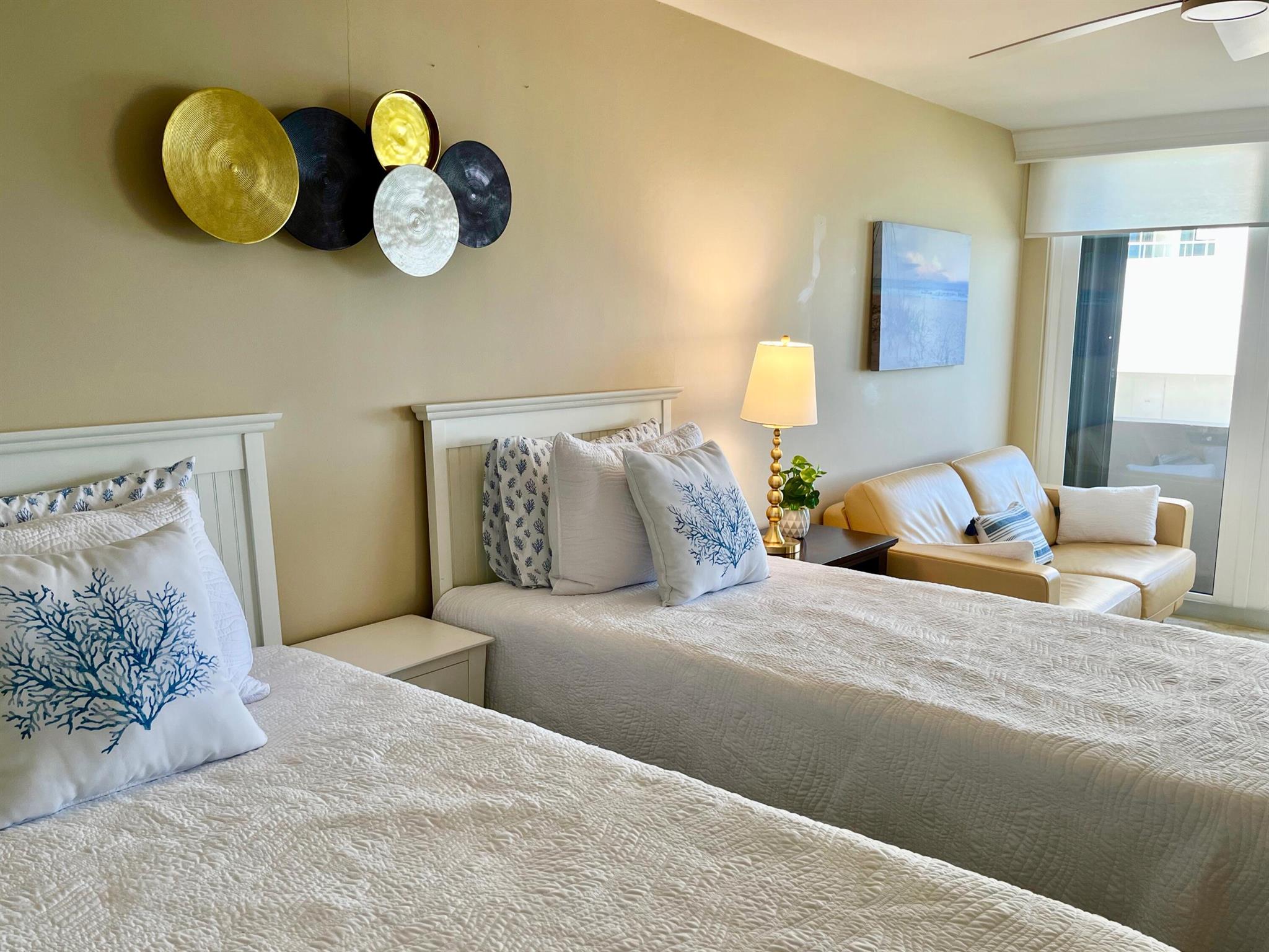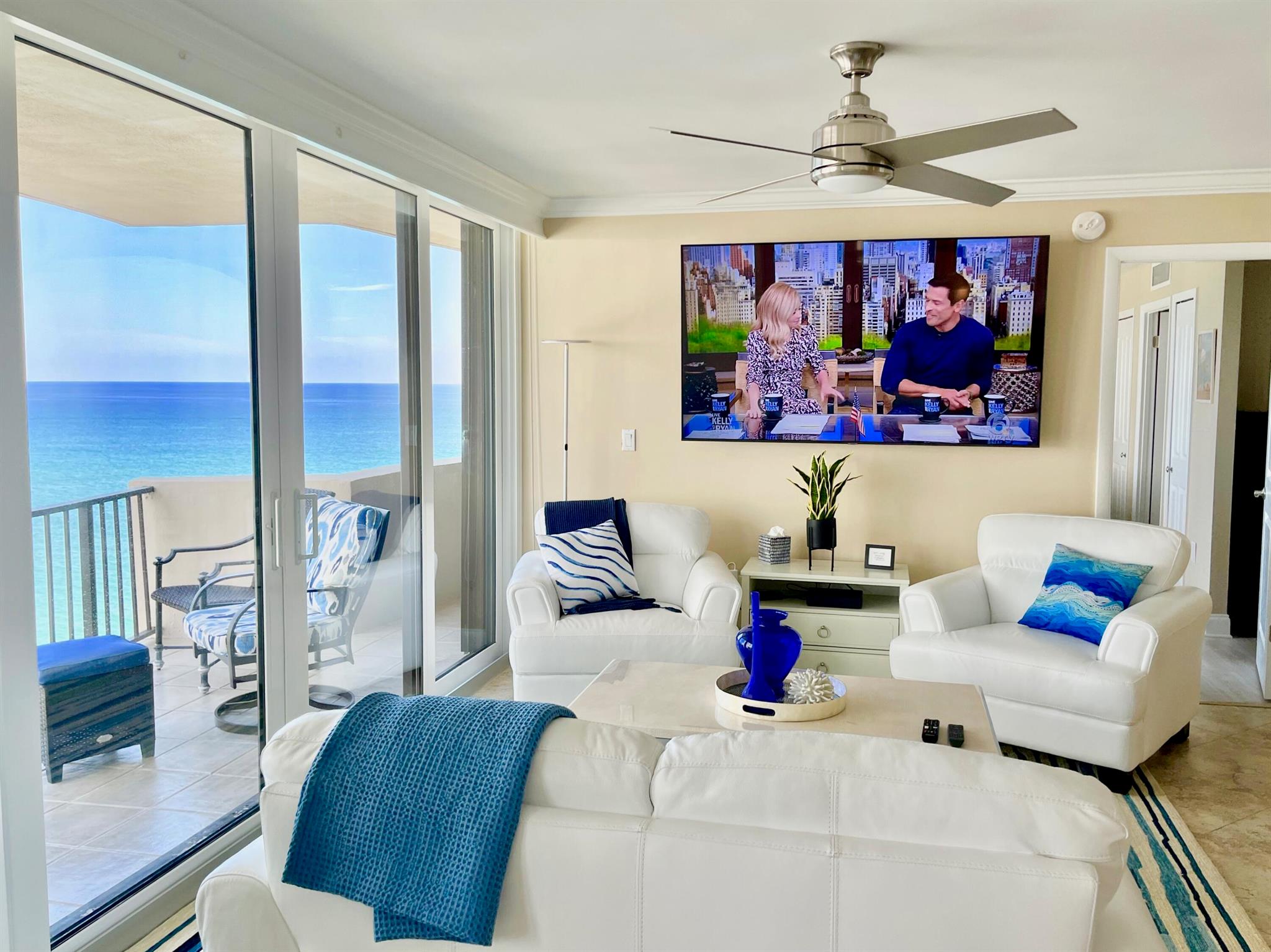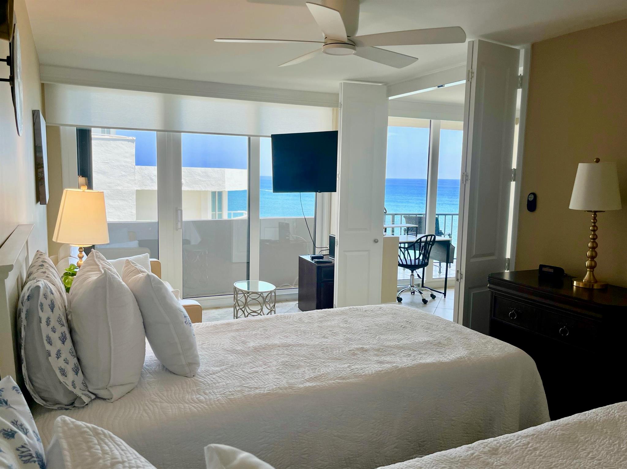 OCEANFRONT ''A'' TOWER - every room has an ocean/Intracoastal view! TOTAL remodel w smooth ceilings, IMPACT glass, decorator shades, recessed lighting, fans w remotes. New wood look flooring in bedrooms. Kitchen + bathrooms updated w granite, new mirrors & crown molding. King Bed in primary suite & 2 twin beds in guest BR + Queen Sleeper Sofa. BOSCH A/C & washer/dryer in the interior laundry room. Enjoy ocean beachfront living at its best! Heated pool on elevated deck between Towers, fitness, tennis courts + private walkover to ocean. Assigned parking #60 close to entry door. Electric to be subtracted from security deposit. Includes Beach Chair Club Service (2 chairs + 1 table). Non-Smoking Condo, no pets allowed. RENTED JAN-MAR 2026