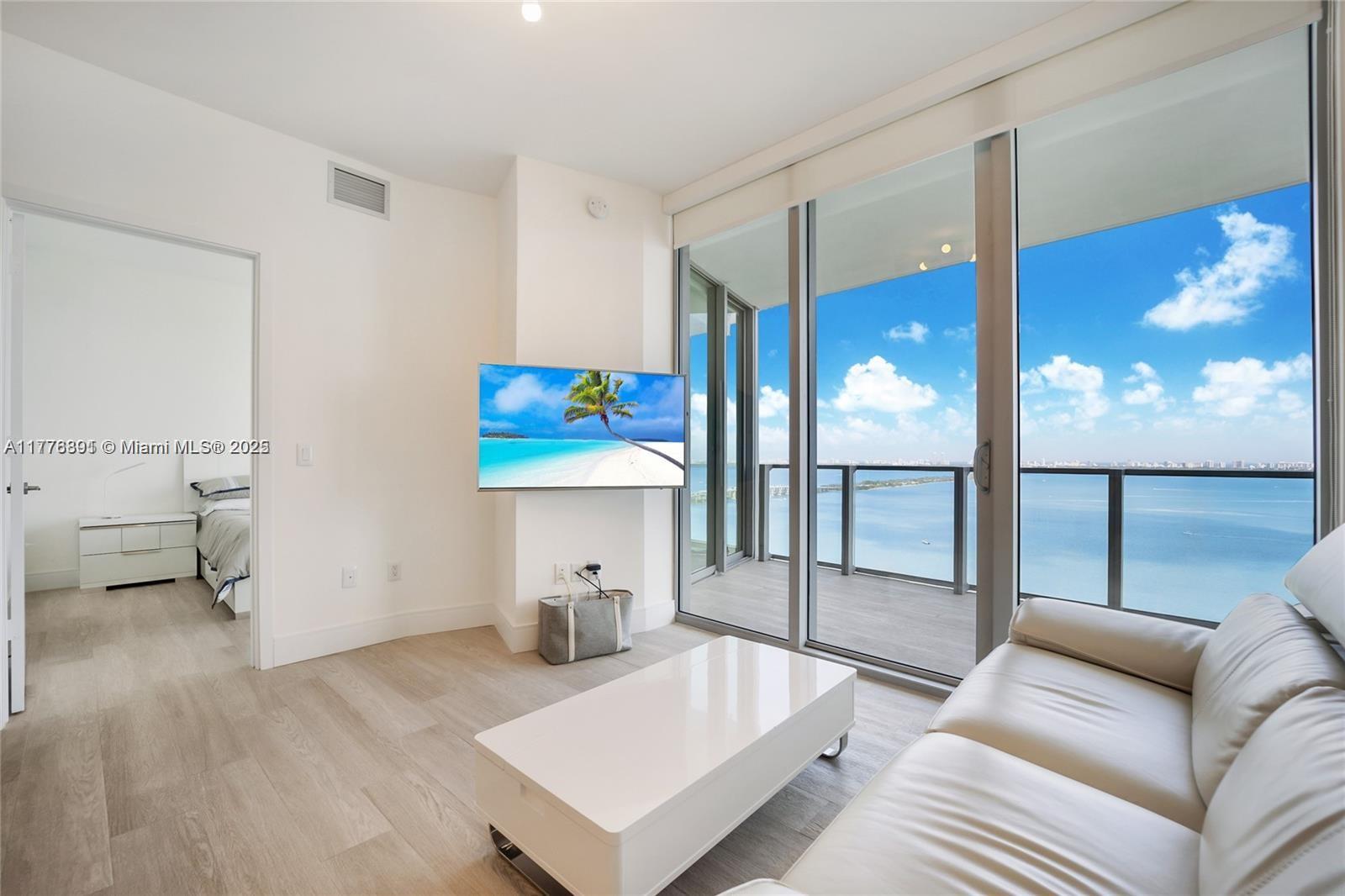 Lease starting May 2026. 12 Month lease, Furnished only, floor-to-ceiling windows, blackout shades, private elevator foyer, built-out closets, direct water views with balcony access from both bedrooms and the living room. There is one garage self parking space. No pets. Luxury building with fitness center with spa, beach club, volleyball court, cabanas, multiple pools and tennis courts. Note- the building has construction which includes the unit balcony being temporarily closed. Thus, the unit is available for a 12 month lease starting May 2026. The application approval process can take up to 30 days. Ideally a tenant secures unit and applies for building approval by April 2026.