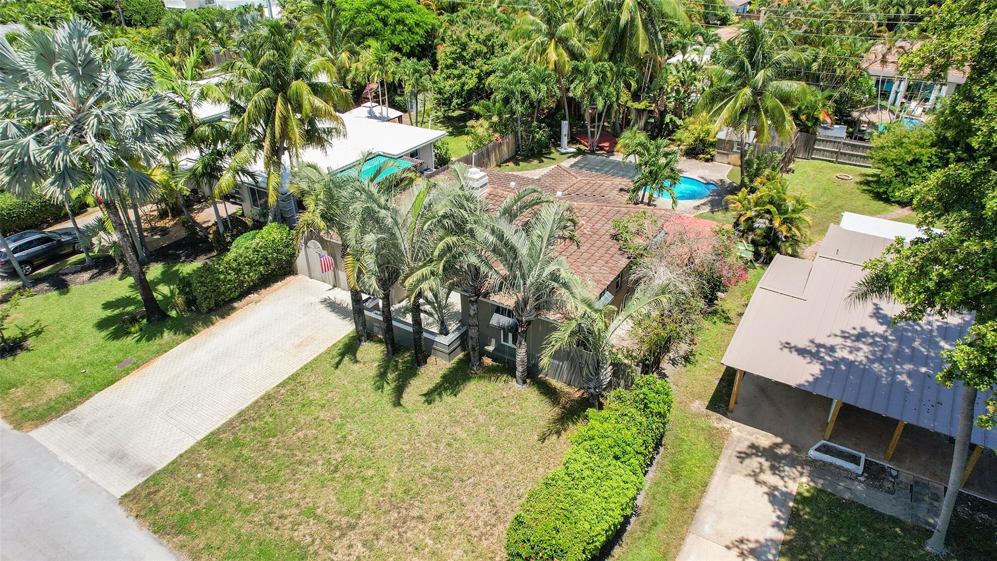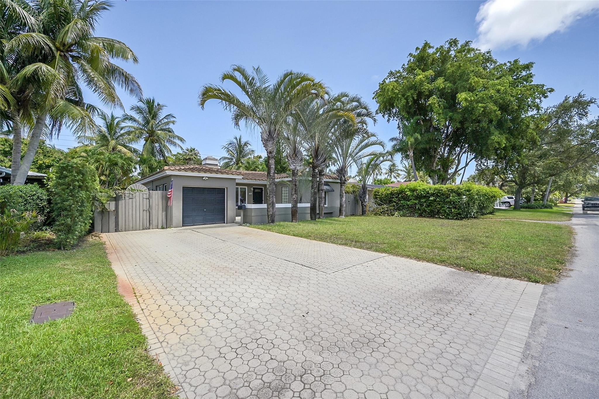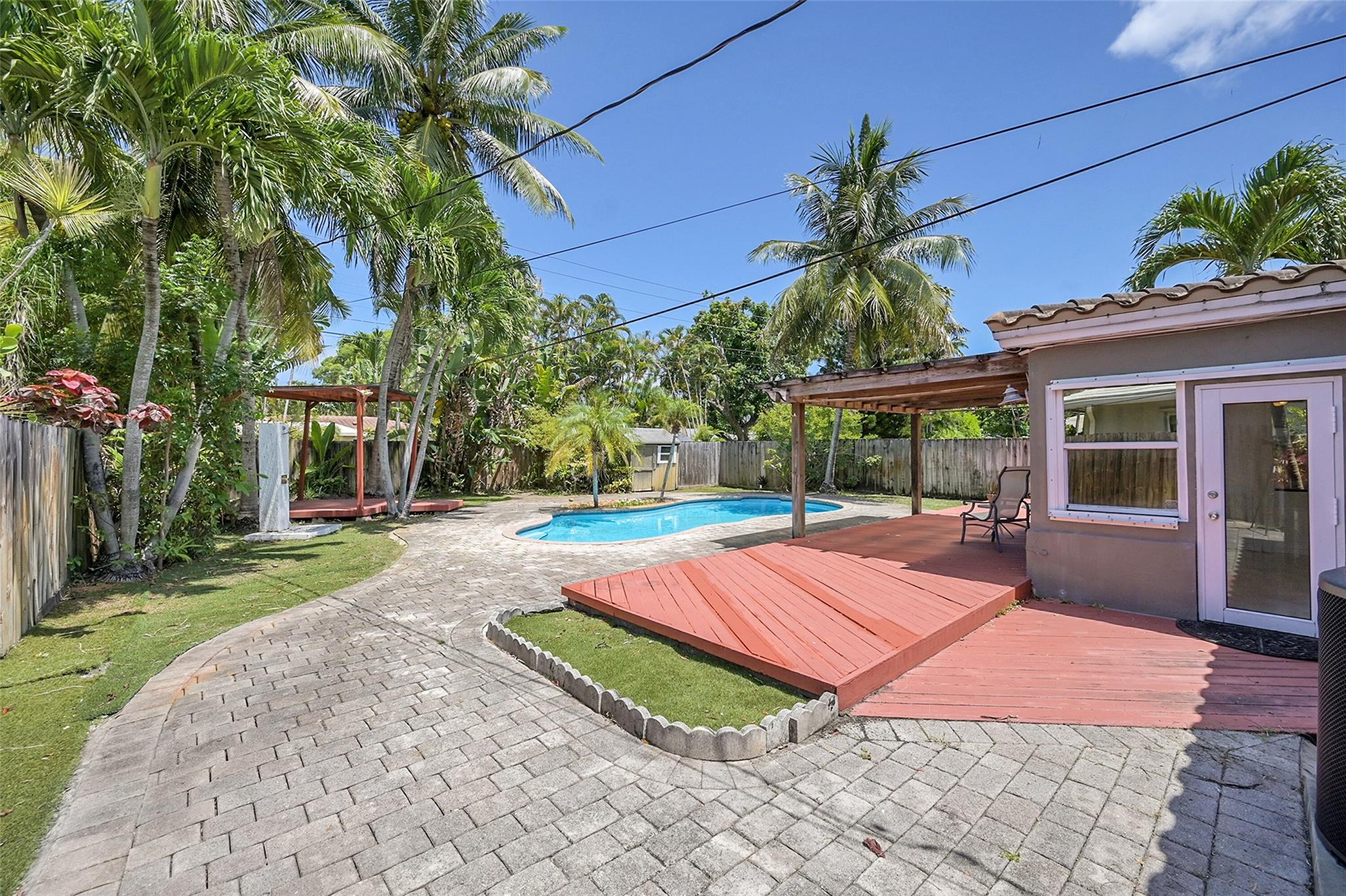 This beautiful home is located in Poinsettia Heights area of Ft Lauderdale. Enjoy the views of the large tropical backyard pool area. This three bedroom, two bath home has marble floors, renovated kitchen and baths with step- in showers. Bedrooms all have access doors to the yard. Yard has wood covered deck for out door living. The garage has been converted into third bedroom. Pool is heated.