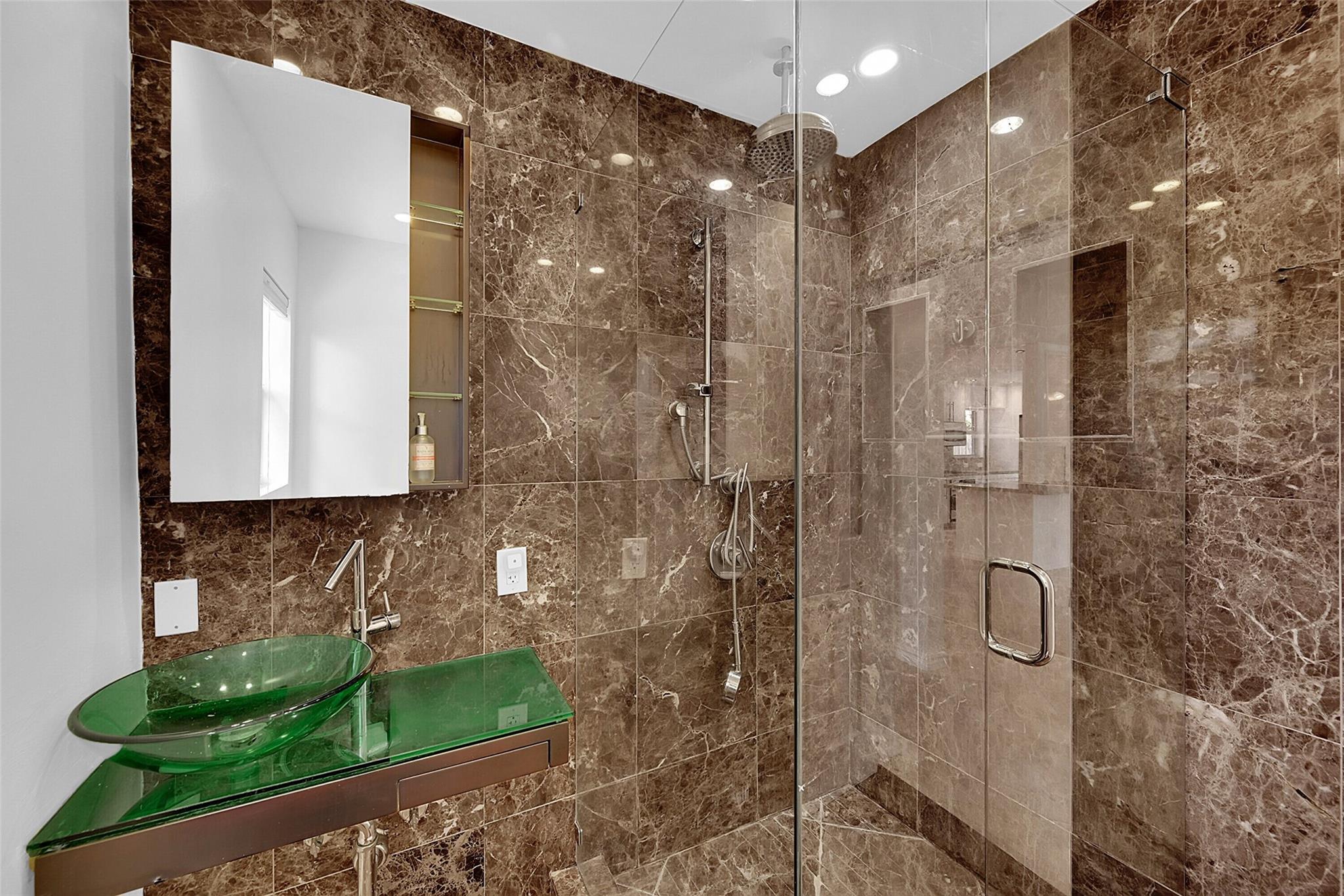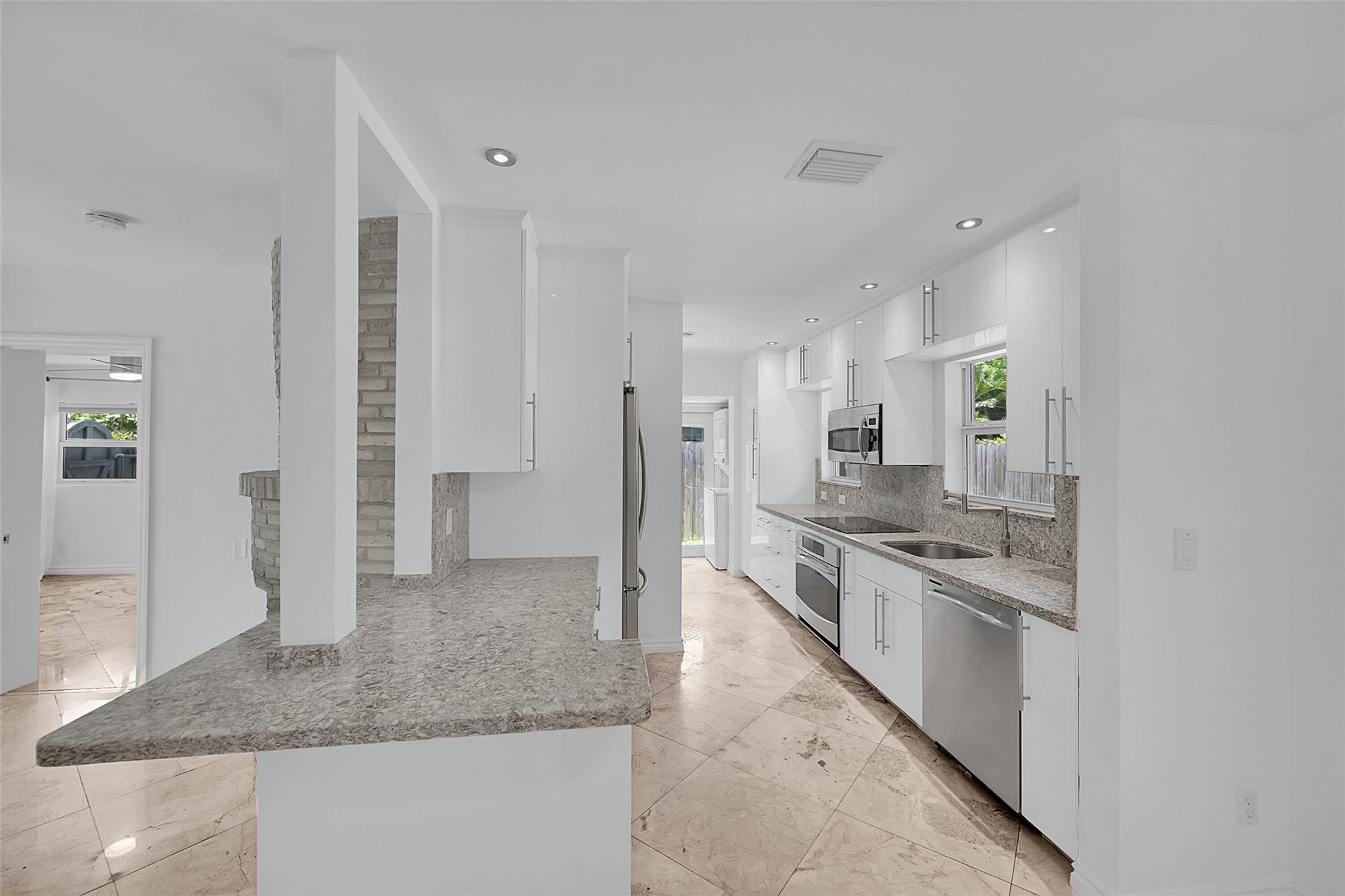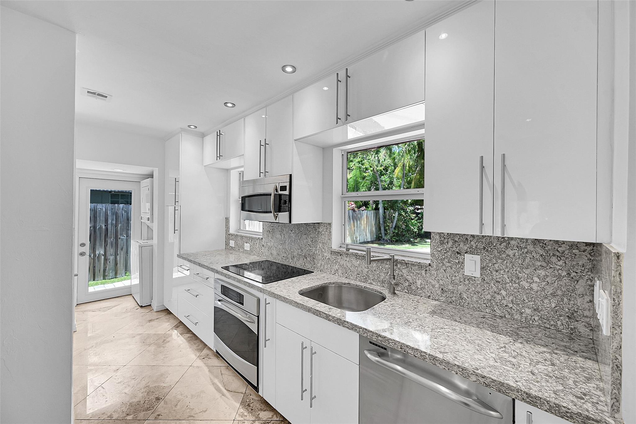This beautiful home is located in Poinsettia Heights area of Ft Lauderdale. Enjoy the views of the large tropical backyard pool area. This three bedroom, two bath home has marble floors, renovated kitchen and baths with step- in showers. Bedrooms all have access doors to the yard. Yard has wood covered deck for out door living. The garage has been converted into third bedroom. Pool is heated.