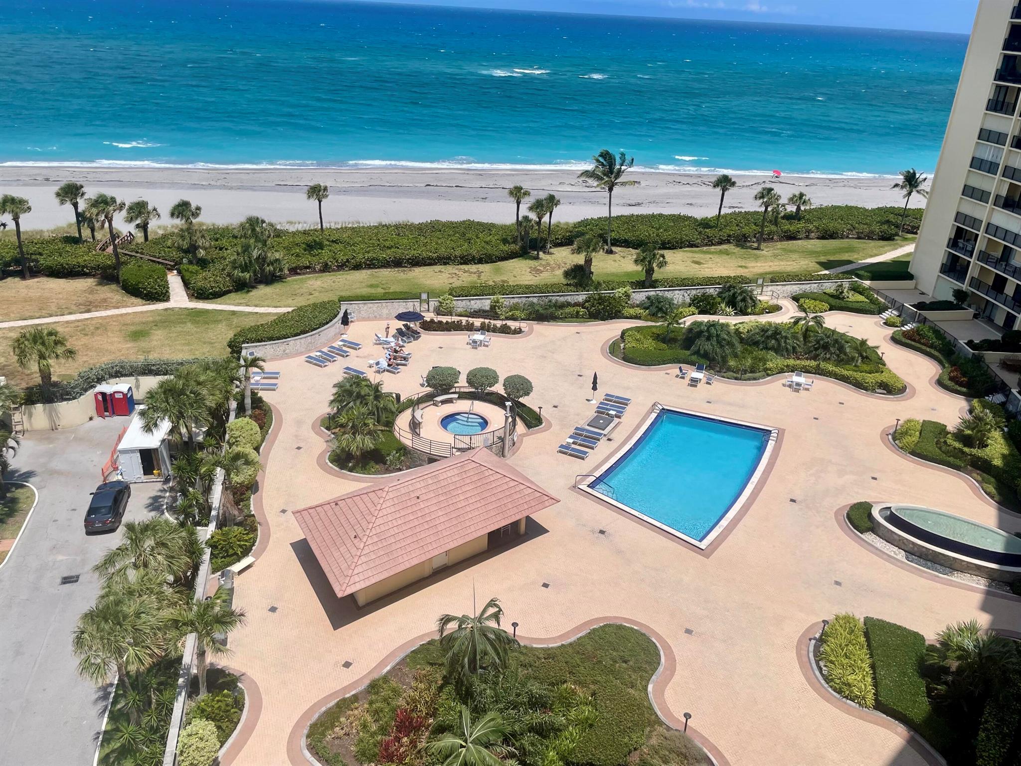 Your winter getaway awaits! Live on the beach! Gorgeous fully furnished END unit oceanfront condo with breathtaking views, 3 balconies. Enjoy the ocean breezes from this completely updated & fully furnished condo. This home offers new hardwood floors, sonos speaker sys. custom blinds. Kitchen is updated w/ quartz counter tops. 2 well-appointed custom bathrooms. Master has a King bed, custom closet. Guest room has queen murphy bed. Three new TVs. Walk to restaurants, shops, theatre, mini golf, Jupiter Inlet. Beaches and resort style pool steps away from your door. Enjoy the gym, tennis, pickleball within Ocean Trail. A par 3 golf course open to the public, is in walking distance. This property will be beautifully furnished and turnkey, for your winter getaway! Garage parking