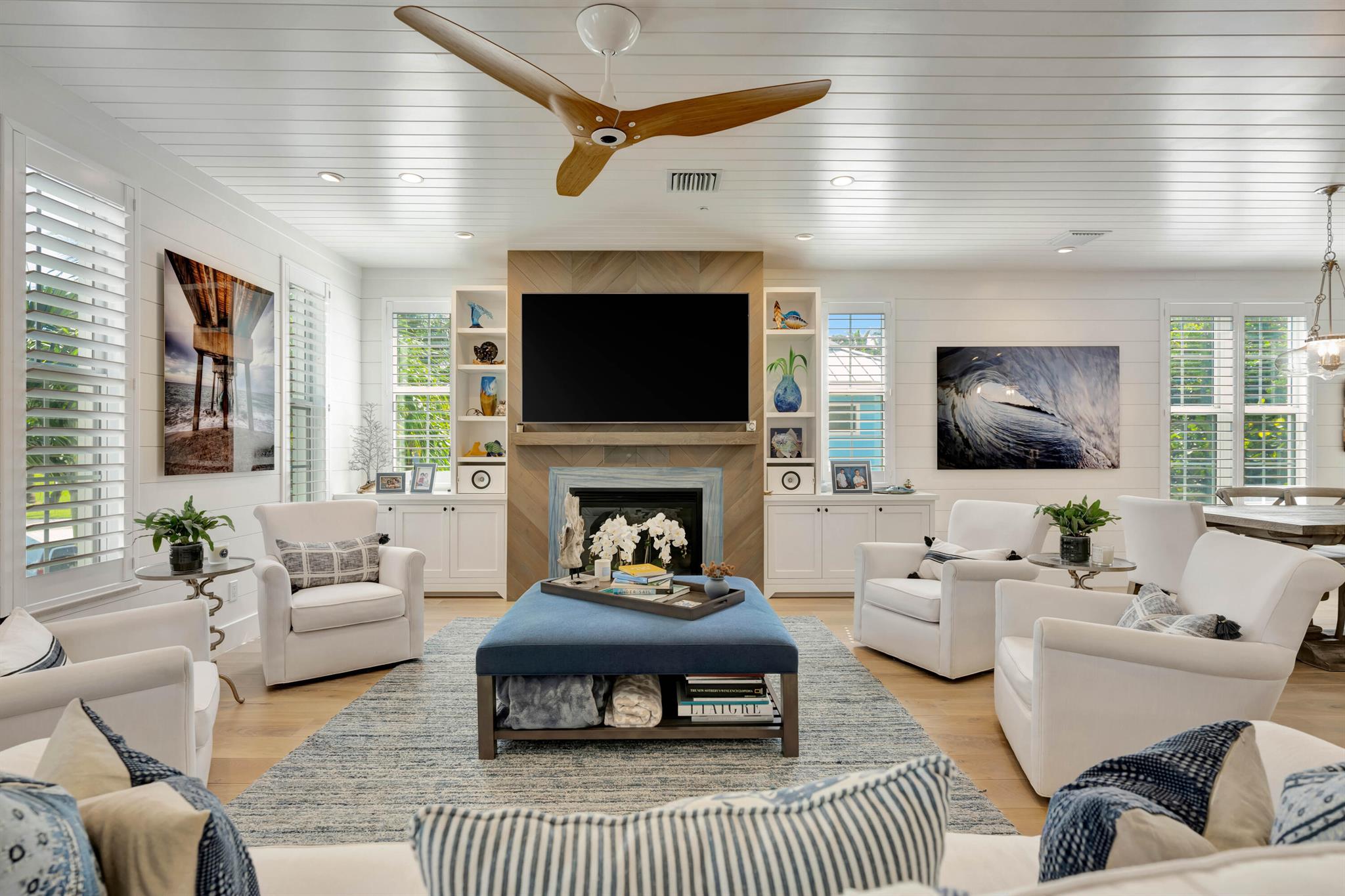 SEASONAL FURNISHED RENTAL. Experience luxury coastal living in this stunning four-story townhome located in the highly sought-after Seaside community of Juno Beach, nestled on the coveted ocean block of Mercury Circle. Spanning 4,277 square feet, this exquisite residence offers unparalleled panoramic views of the Atlantic Ocean from its expansive 507-square-foot top-level deck. Imagine unwinding in the hot tub while sipping on your favorite wine or cocktail, taking in the breathtaking surroundings. This home is a masterpiece of craftsmanship, boasting incredible custom millwork, including shiplap details that add to its coastal charm. The open-concept Chef's kitchen featuring a gas stove opens up to the family room, complete with a cozy fireplace, create an