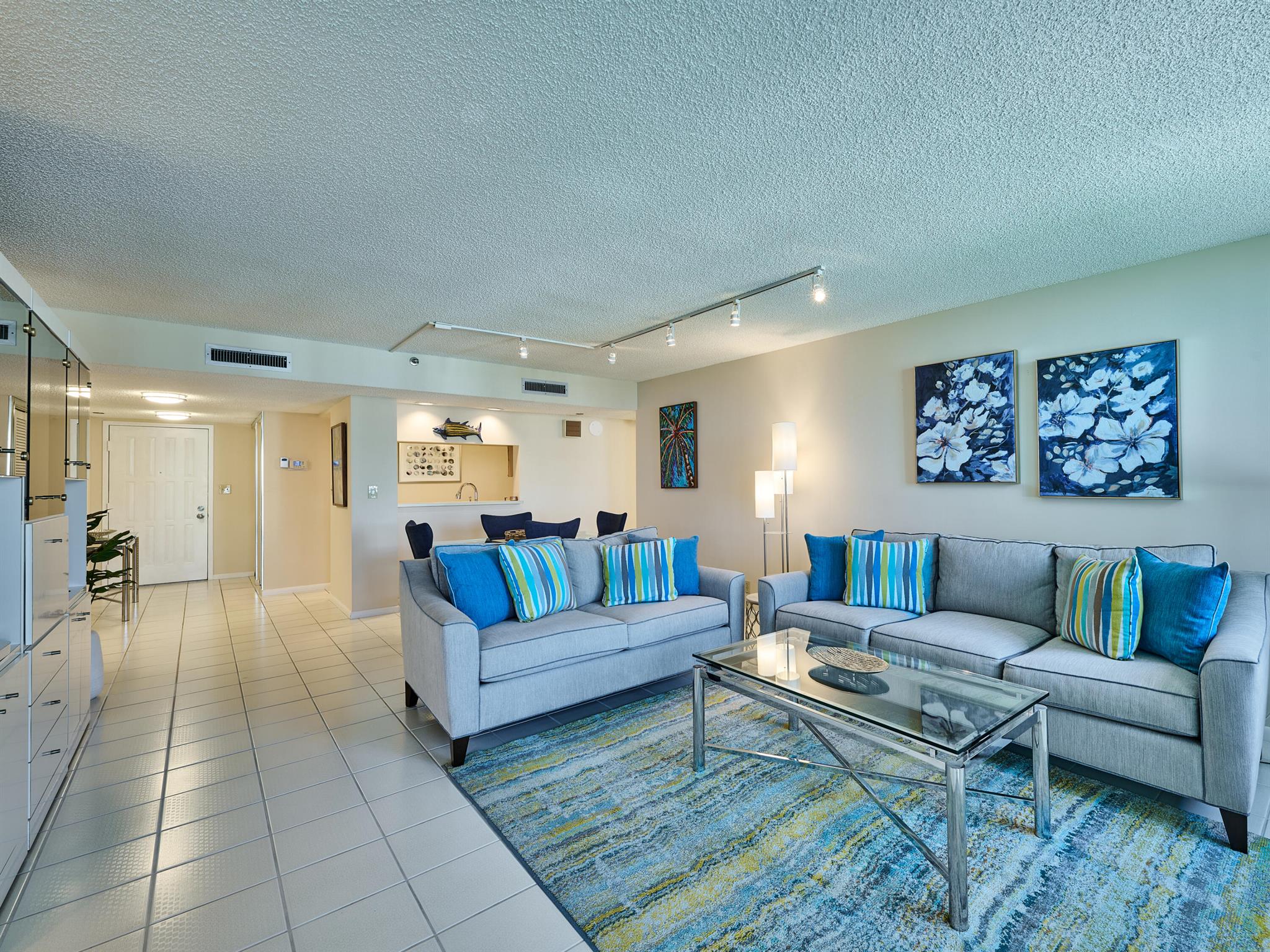 Enjoy the ocean view from your spacious lanai , perfect for relaxing or entertaining. Outfitted with chaises, cocktail tables, a dining table, and a cozy chair set, this outdoor space features a remote-controlled ceiling fan with three light temperatures.Inside, the living room boasts a newly furnished Cindy Crawford furniture package, and both the dining area and second bedroom have brand-new furniture as well. Sliding doors from the living room and both bedrooms open directly onto the lanai, while solar shades in the living room filter the afternoon sunlight.***Available for Annual at $5,000 per month Seasonal minimum 4 months $7,000 per month***Both bedrooms are fully furnished with Smart TVs, ample storage, and vertical blackout blinds. All mattresses and pillows come w