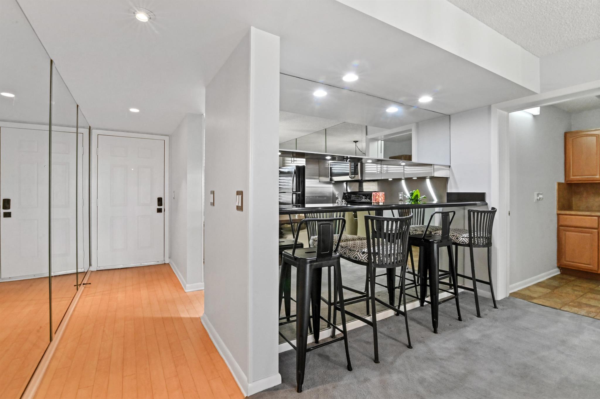 Experience luxury living at its finest in this exceptional 4th floor end unit, thoughtfully updated to perfection. With full impact windows, indulge in the seamless blend of style and functionality showcased by the Heritage maple kitchen cabinets with stainless steel finish, complemented by sleek black appliances and stunning granite counters. The bathrooms have been completely transformed with frameless showers and an elegant marble guest bath Jacuzzi, exuding opulence at every turn. This spacious 2-bedroom, 2-bathroom condominium boasts a bonus room, offering a generous 1385 sq.ft. of meticulously designed living space.