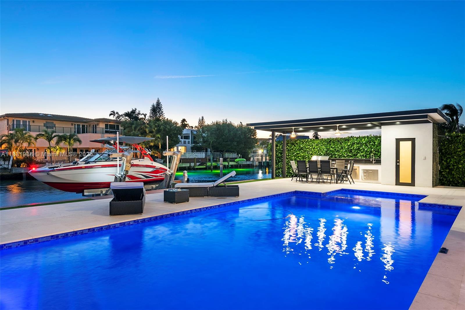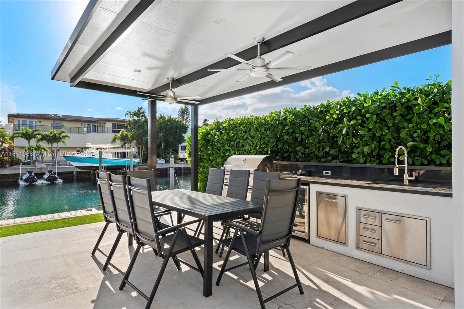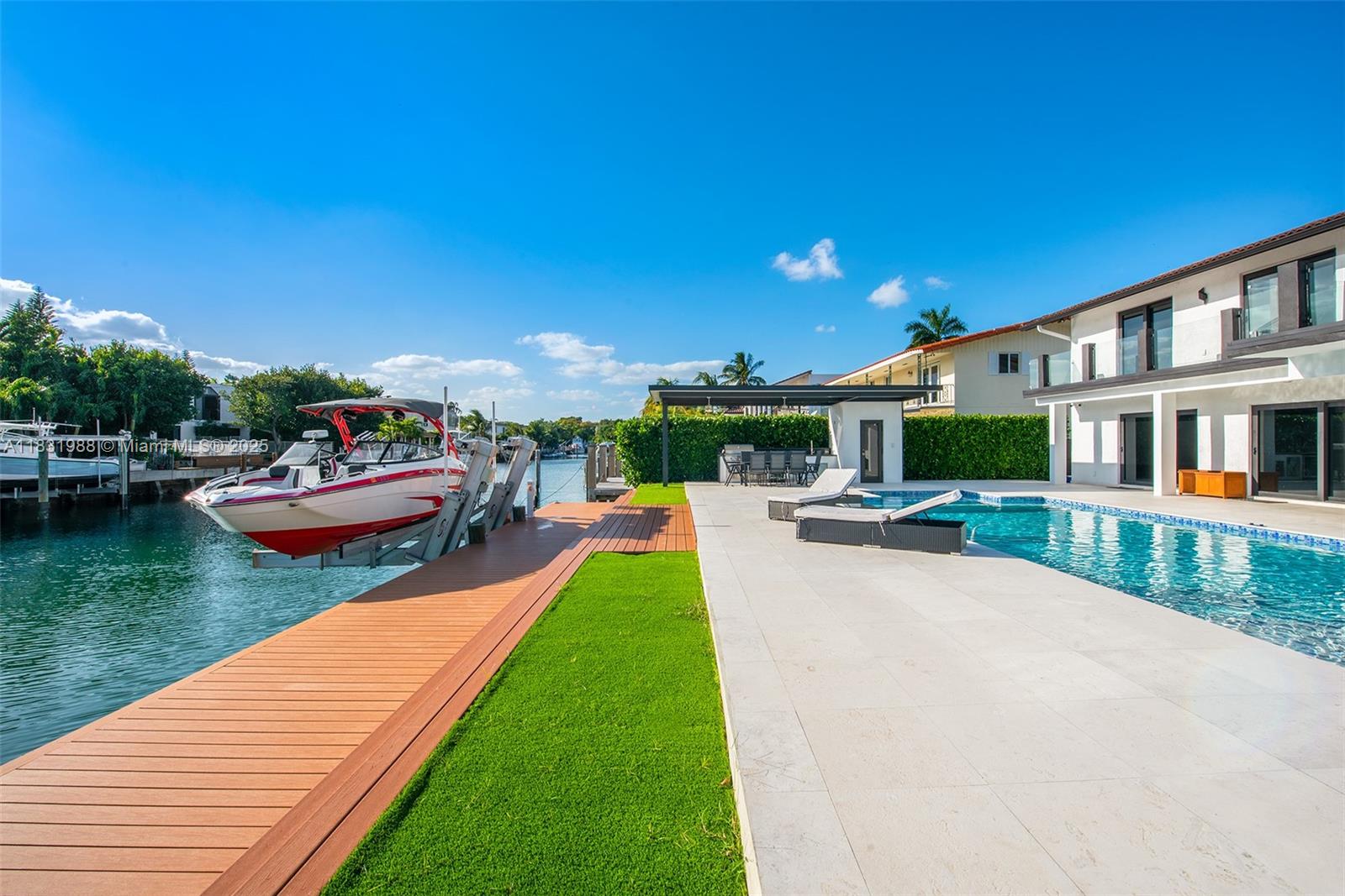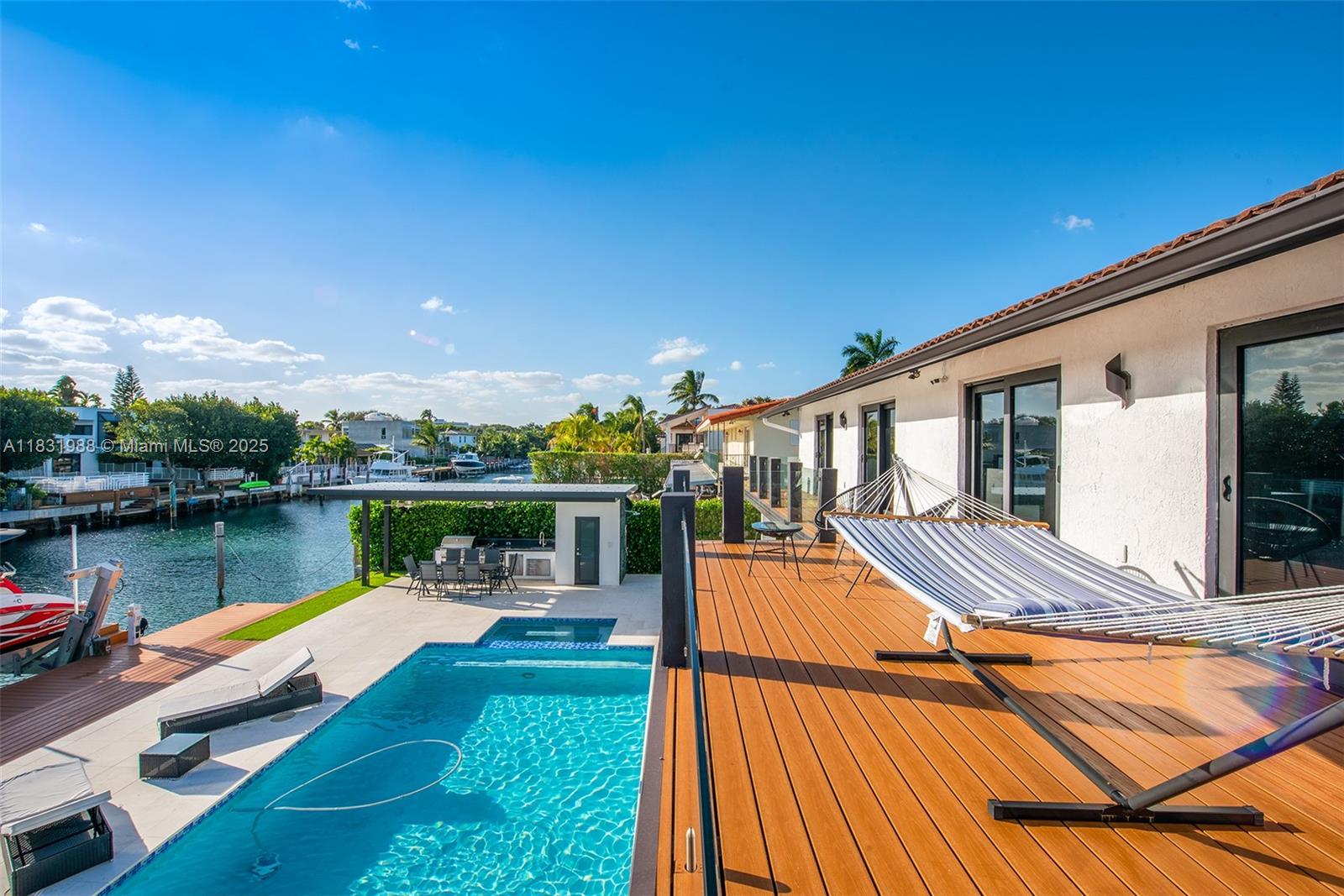 Welcome to this exquisitely 4 beds, 5 baths waterfront. Step inside to an open floor plan with water views from every room. The chef’s kitchen featuring a large island, custom cabinetry, and top-of-the-line Miele appliances. Porcelain/travertine floors add a touch of timeless throughout the home. The primary suite is a private retreat with its own terrace overlooking the pool and canal. The master bath includes dual vanities, double rainfall showers, and a Jacuzzi tub perfect for unwinding in luxury. Step outside to your own backyard paradise. Enjoy a covered outdoor kitchen, heated pool with spa, and 75 ft of waterfront and Jet Ski dock, just minutes to open bay. Extras: Tesla charger, 2-car garage, San Souci offers 24/7 gated security with on-site police presence.