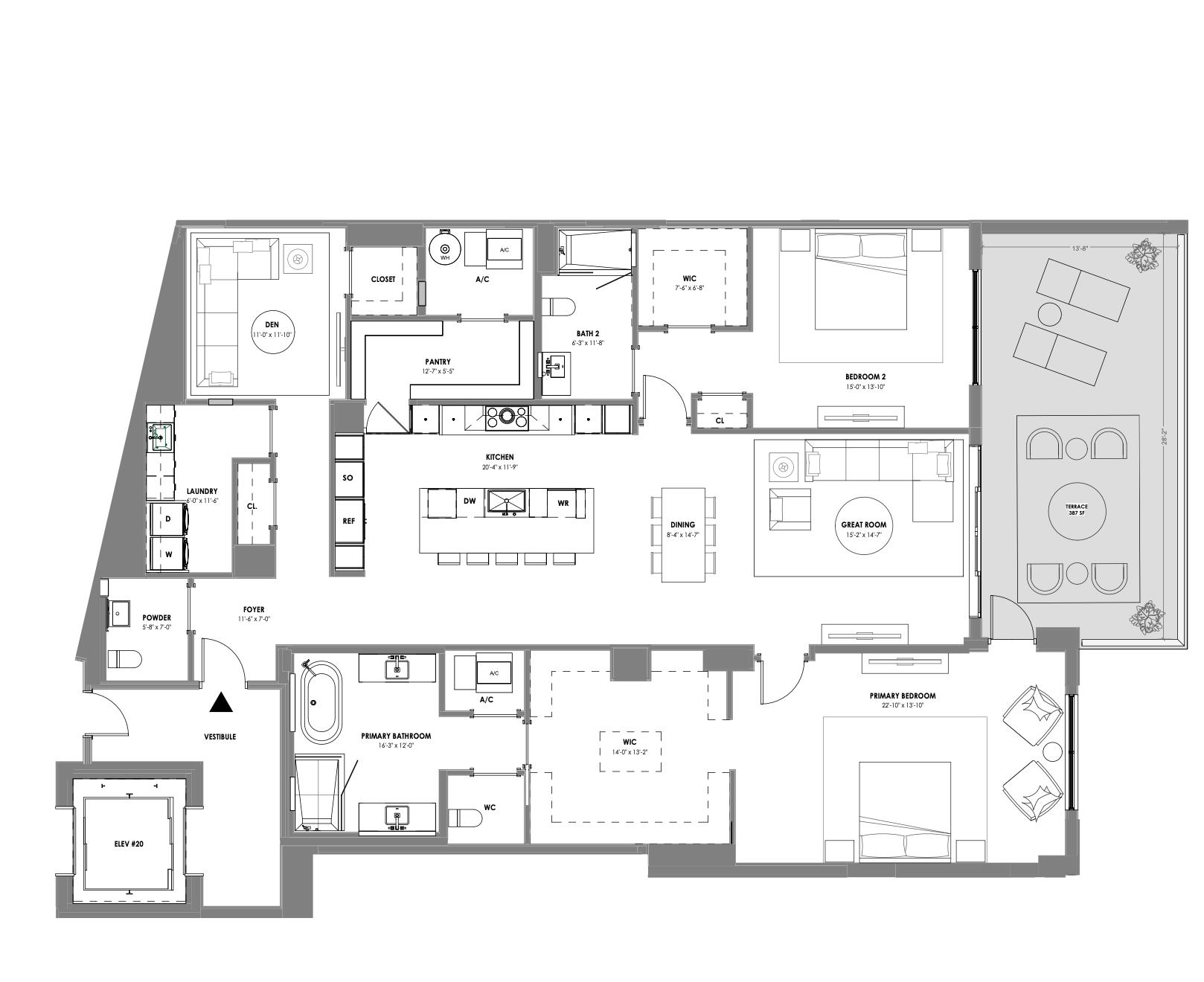 This elegantly furnished, turnkey residence with panoramic golf views is offered as a seasonal rental in the sought-after ALINA Residences, located in the heart of downtown Boca Raton. Perched on the 7th floor, adjacent to the pool, fitness center and spa, this exceptional condo delivers an elevated standard of luxury living. The thoughtfully designed floor plan features two spacious bedrooms, a flexible den, and two-and-a-half bathrooms. With private elevator access opening directly into the residence, you're welcomed into a bright, open-concept living space framed by dramatic floor-to-ceiling windows. Expansive terrace provides the perfect setting for golden-hour sunsets and outdoor dining. Inside, curated details abound from custom closets and