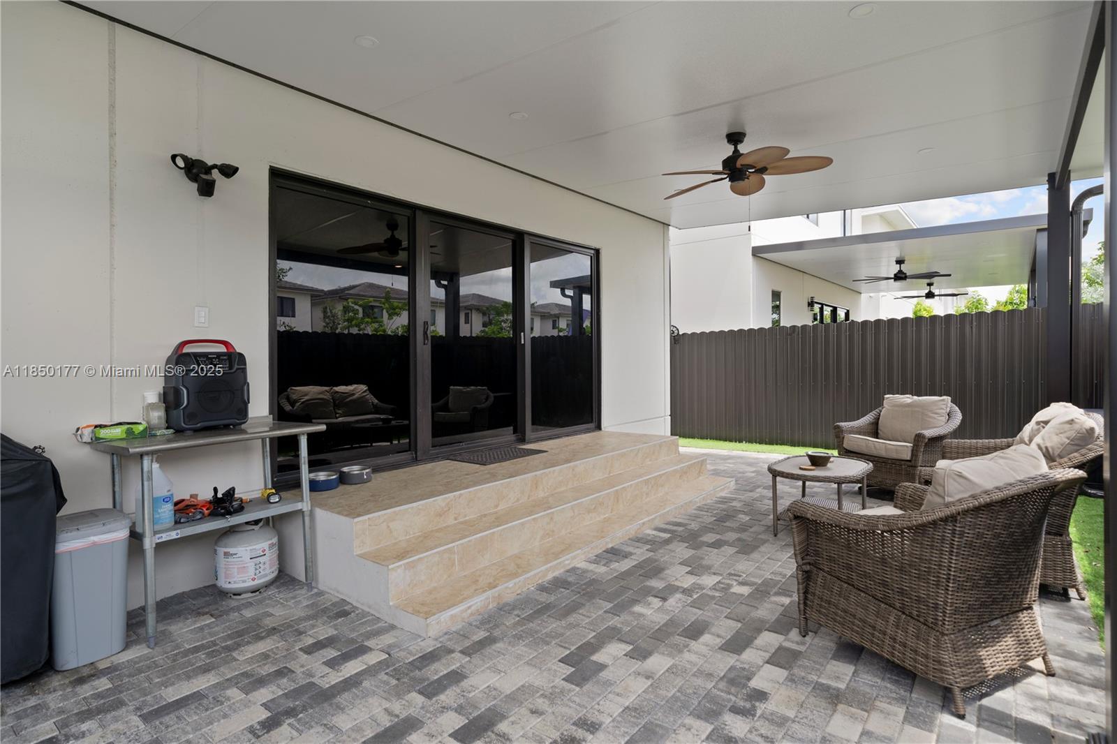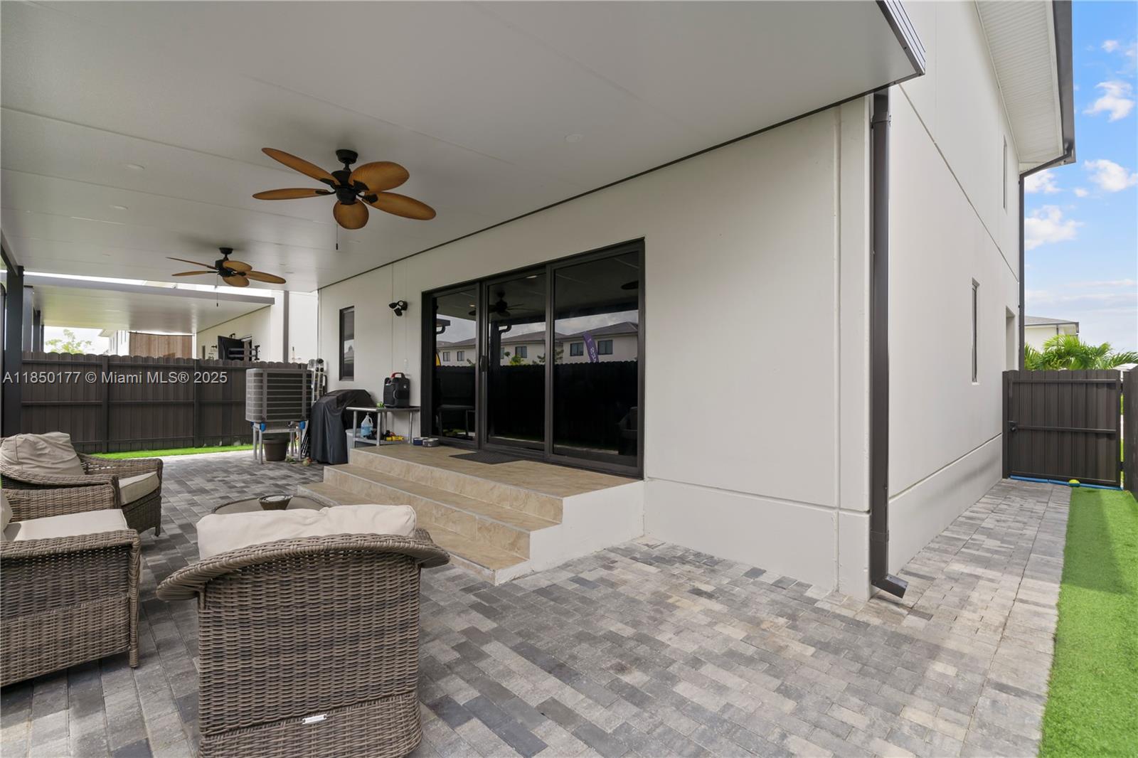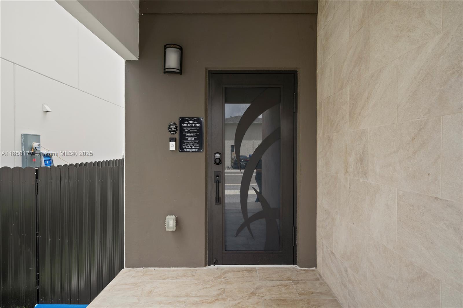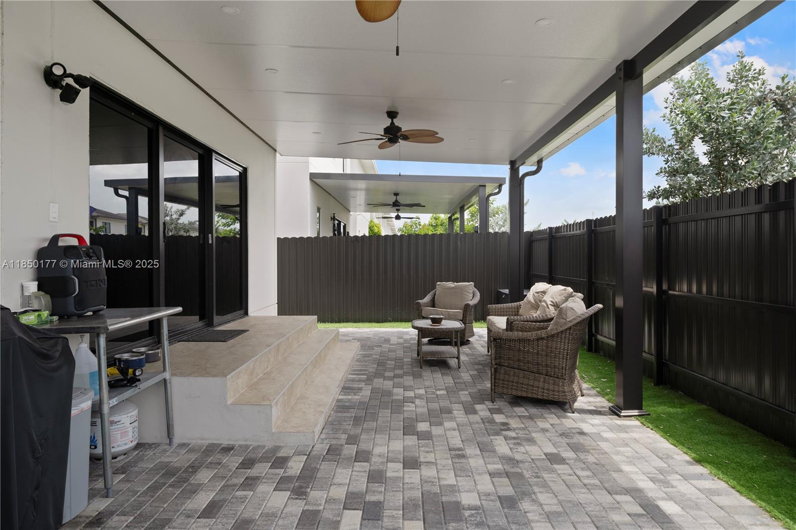New construction rental with high-end upgrades! Only 2 months to move in. This concrete built home includes a full 1/1.5 downstairs, a 4/3 upstairs and space to park 4 cars comfortably on a paved driveway. Interior upgrades: Window blinds, tints and fans in all rooms. An upgraded front door w/a digital keypad. Exterior upgrades: Large aluminum covered terrace with fans, built-in lighting, synthetic grass, automatic garage door, and tile throughout the front, back, and balcony. No grass, no maintenance! This home is also equipped w/a hard-wired Ring doorbell camera, and impact windows and doors for your complete safety.