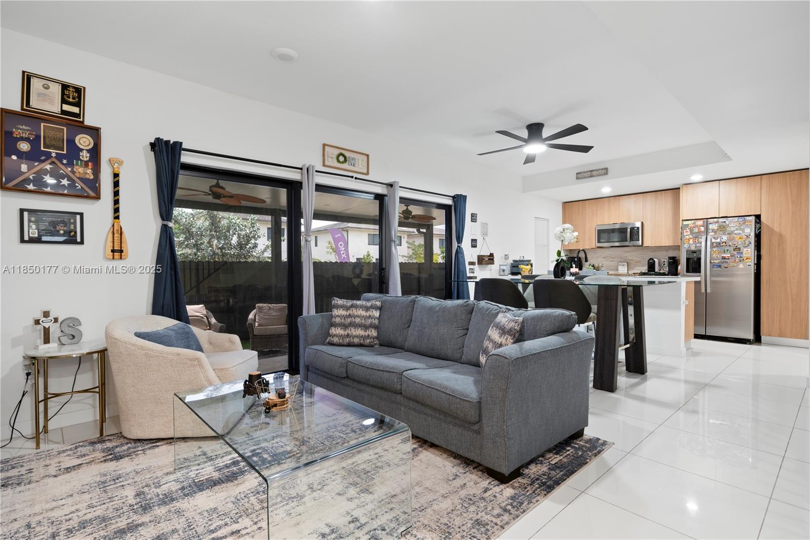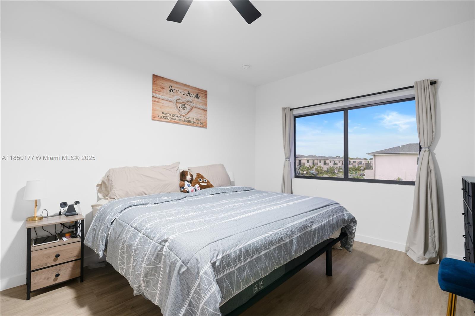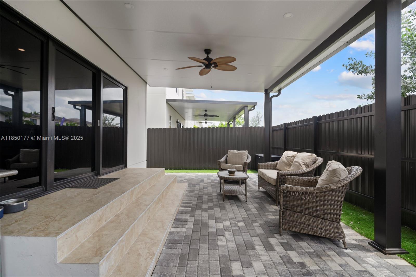 New construction rental with high-end upgrades! Only 2 months to move in. This concrete built home includes a full 1/1.5 downstairs, a 4/3 upstairs and space to park 4 cars comfortably on a paved driveway. Interior upgrades: Window blinds, tints and fans in all rooms. An upgraded front door w/a digital keypad. Exterior upgrades: Large aluminum covered terrace with fans, built-in lighting, synthetic grass, automatic garage door, and tile throughout the front, back, and balcony. No grass, no maintenance! This home is also equipped w/a hard-wired Ring doorbell camera, and impact windows and doors for your complete safety.