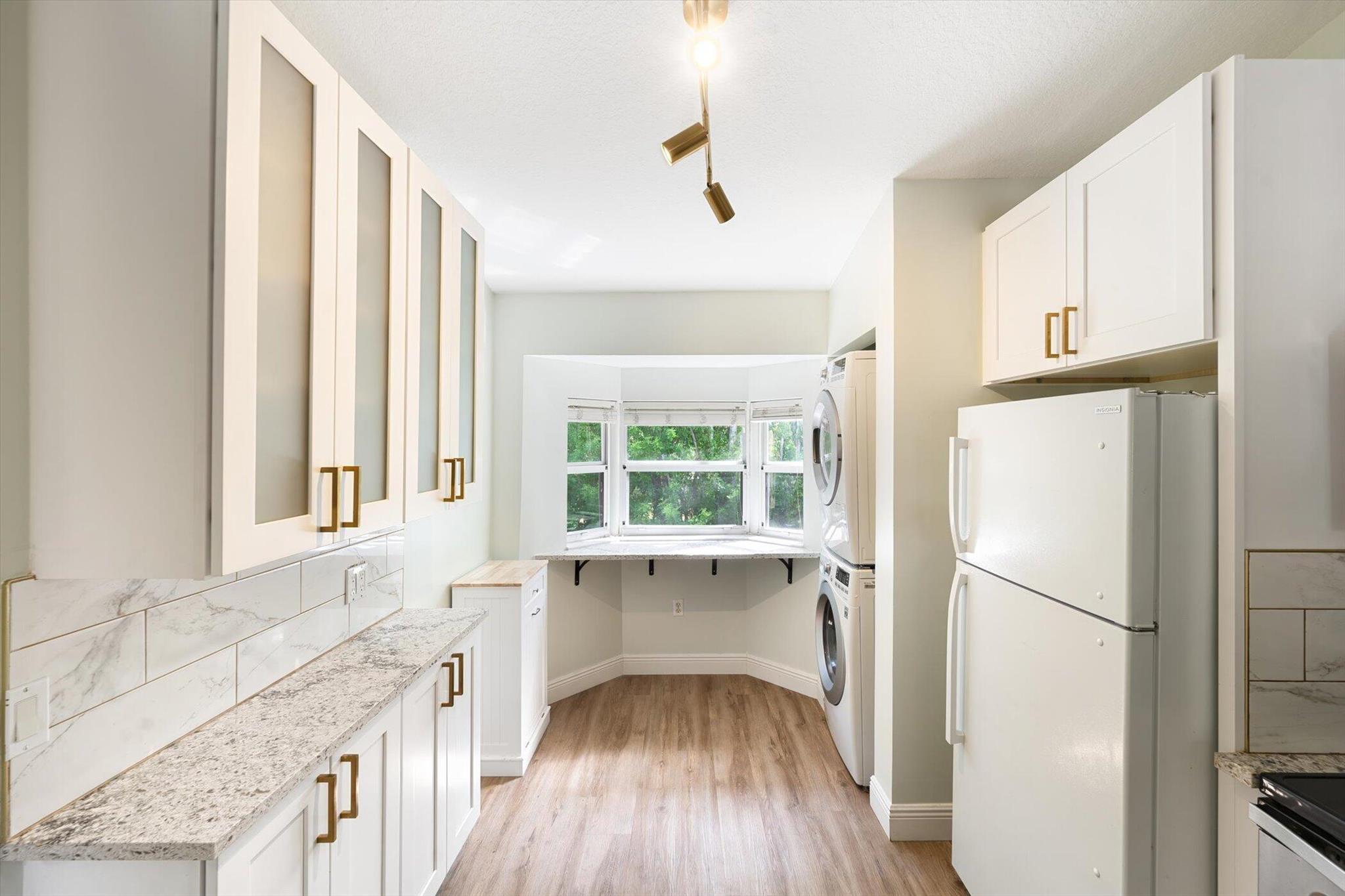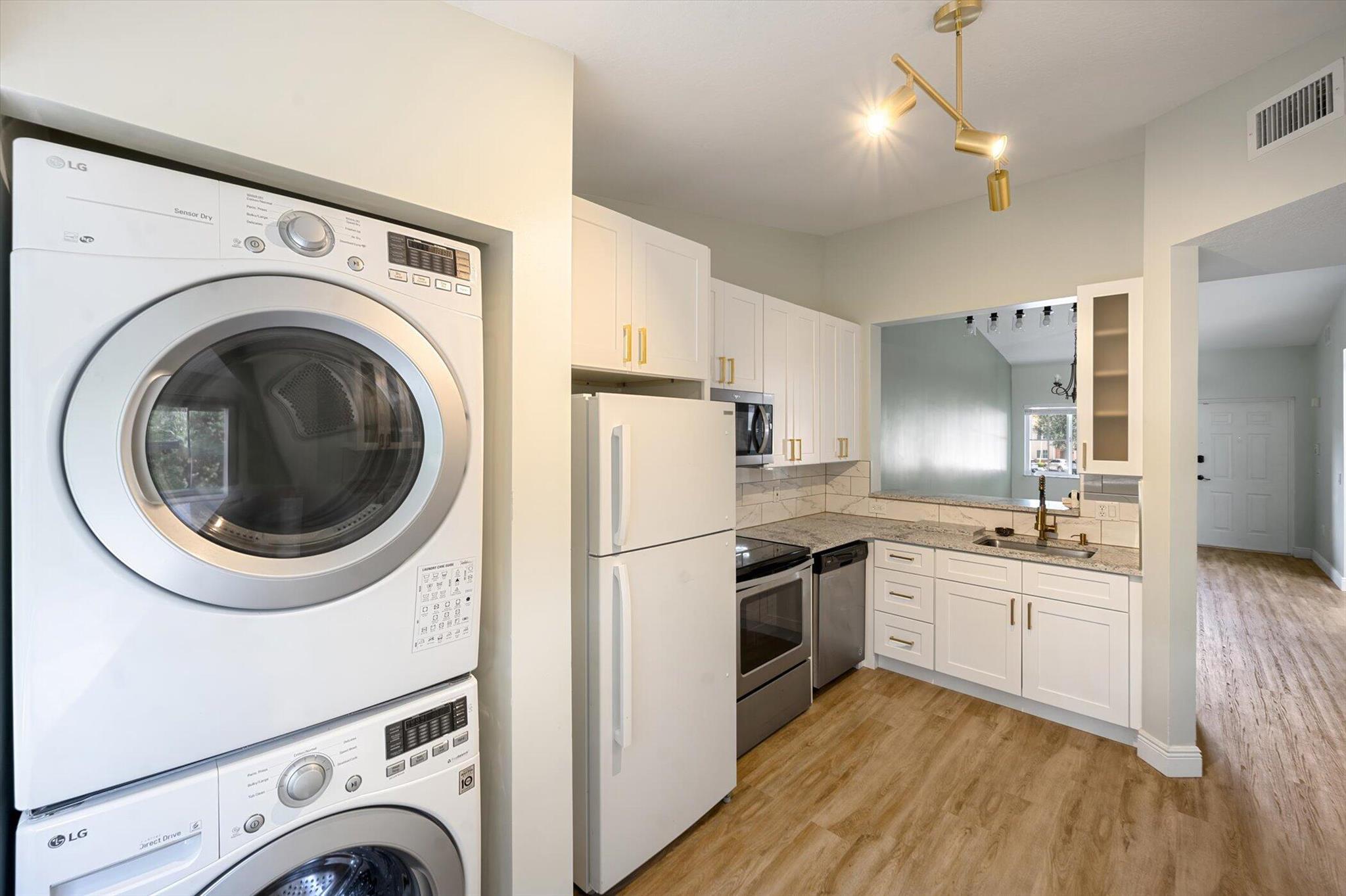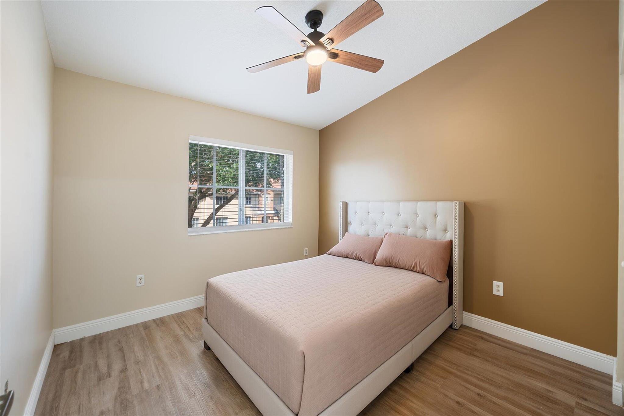 Beautifully maintained 2 bed, 2 bath 2nd floor condo in the gated community of The Cove. This freshly painted unit features brand new in unit washer and dryer, designer fans, plantation shutters, & stylish lighting throughout. Enjoy stainless steel appliances, granite kitchen counters, pot rack, & wood laminate and tile flooring-no carpet. The master bath boasts a glass shower enclosure, & both bedrooms offer ample natural light. Community amenities include a pool, tennis courts, & a short walk to schools. Just steps from the pool, this home is offered in AS IS condition & is a must-see to appreciate. Located just under 3 miles from Tanger Outlets on Palm Beach Lakes Blvd, about 3 miles to downtown's Clematis Street, & approx 4 miles from Worth Ave beach.