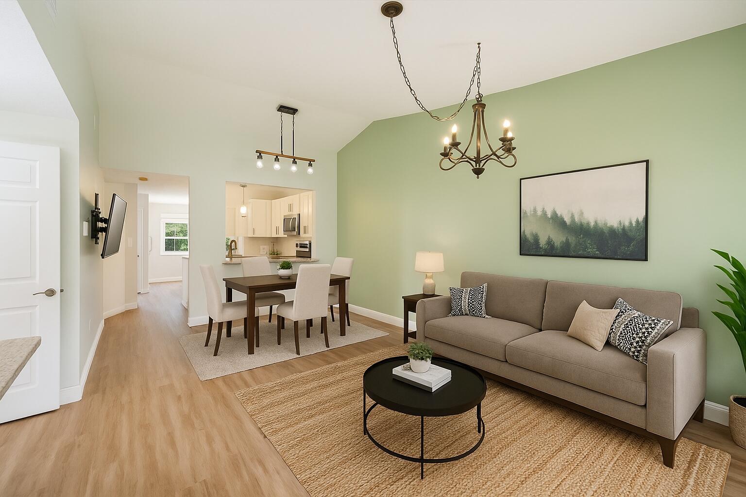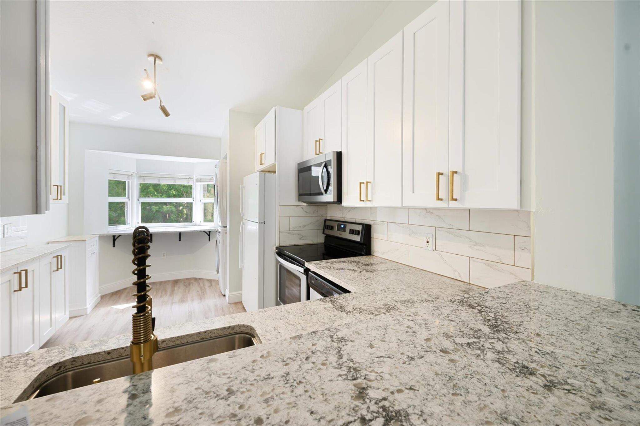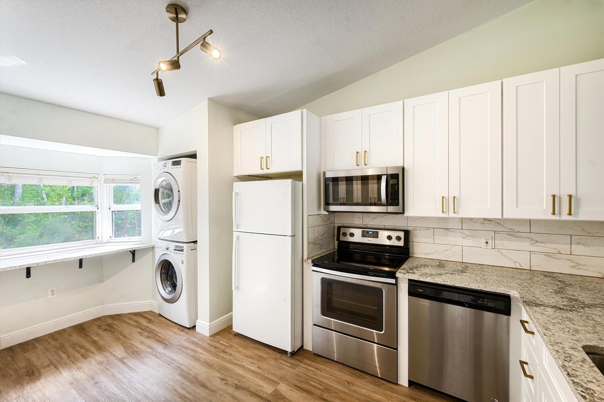 Beautifully maintained 2 bed, 2 bath 2nd floor condo in the gated community of The Cove. This freshly painted unit features brand new in unit washer and dryer, designer fans, plantation shutters, & stylish lighting throughout. Enjoy stainless steel appliances, granite kitchen counters, pot rack, & wood laminate and tile flooring-no carpet. The master bath boasts a glass shower enclosure, & both bedrooms offer ample natural light. Community amenities include a pool, tennis courts, & a short walk to schools. Just steps from the pool, this home is offered in AS IS condition & is a must-see to appreciate. Located just under 3 miles from Tanger Outlets on Palm Beach Lakes Blvd, about 3 miles to downtown's Clematis Street, & approx 4 miles from Worth Ave beach.