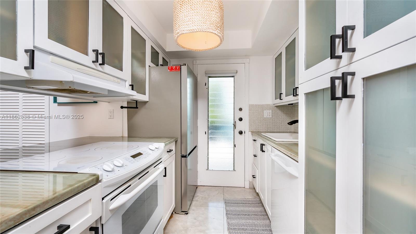 Stylish and inviting corner lanai in a quiet 10-unit boutique building, perfectly located in the heart of Key Biscayne. This fully furnished residence combines contemporary finishes with a warm, homey feel, featuring white marble floors, Brazilian quartz countertops, and custom cabinetry. Large windows flood the space with natural light, while the den with a queen Murphy bed offers the flexibility of a second bedroom. Street-level entry gives it the comfort and privacy of a home. Enjoy FOB beach access just a 5-minute walk away, plus a pool, assigned parking, and free laundry. Smart lock with camera for fingerprint, code, key fob, or app entry. Pet friendly. Available for short-term stays of 3 months or more.
