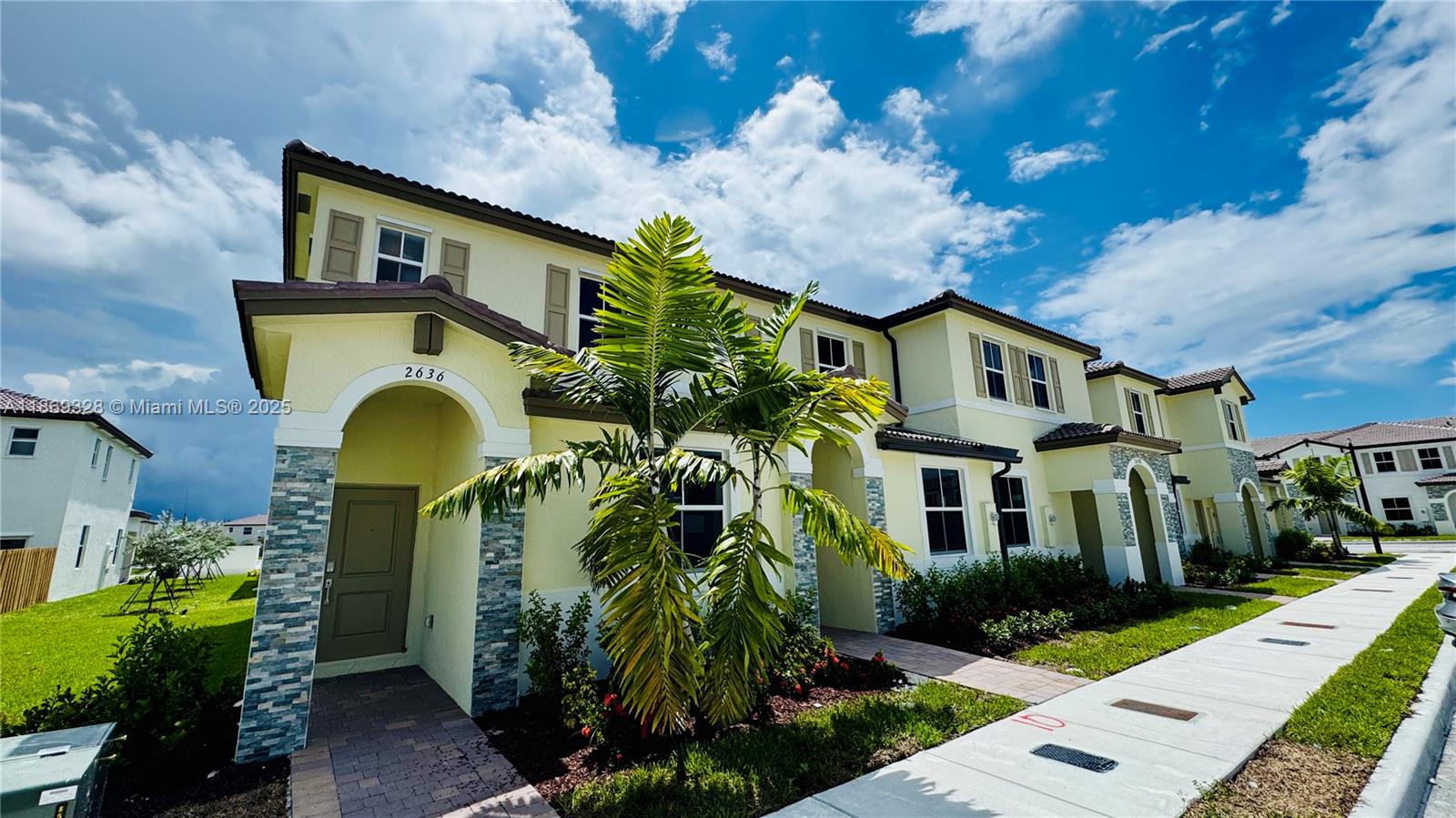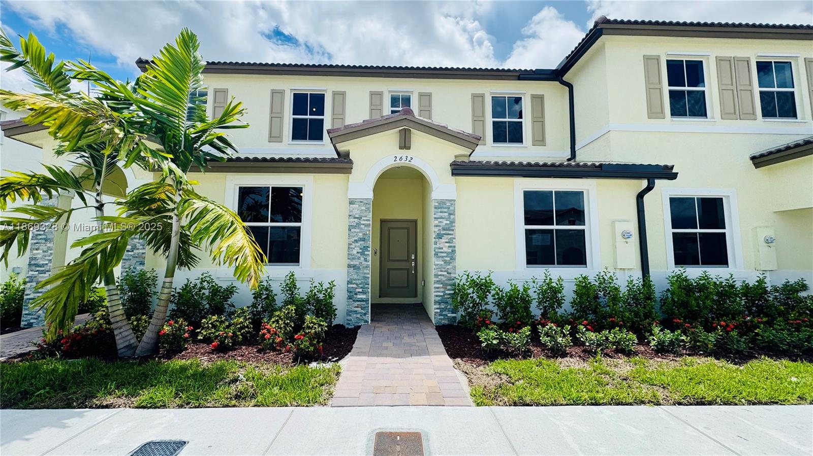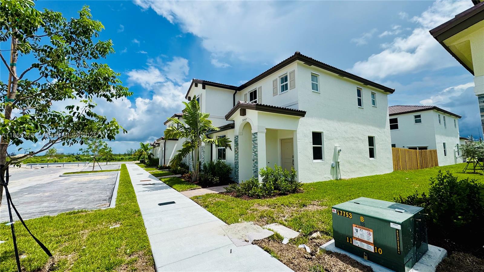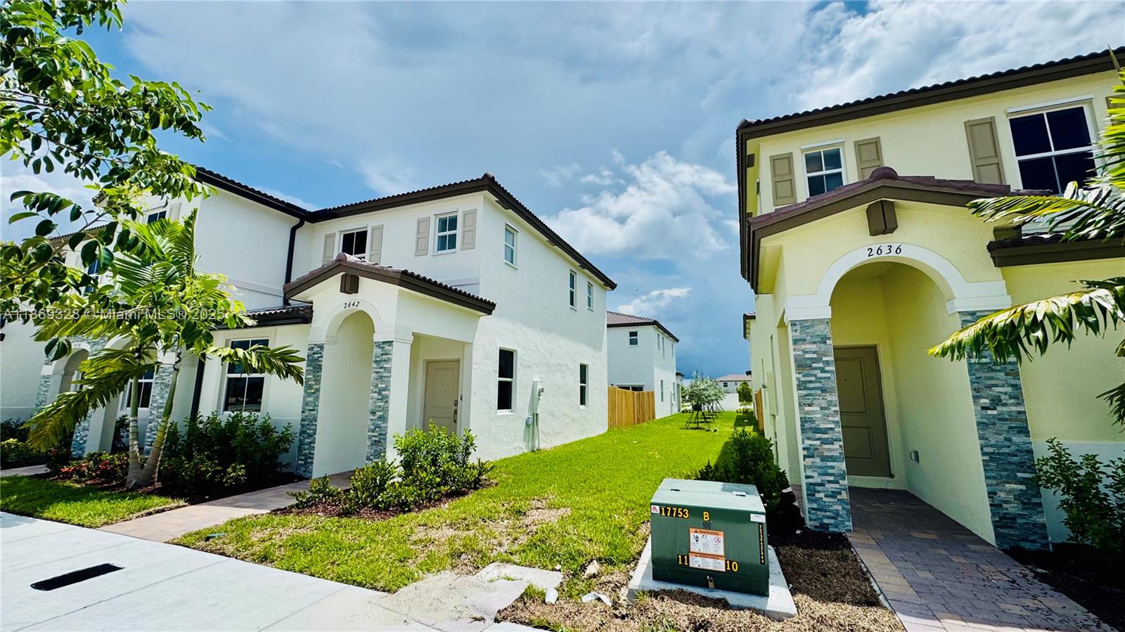 Altamira – Andalucía Collection (Bandol model): 2-story 3BR/3BA ~1,334 SF. The first floor blends family, dining, and kitchen in an open plan, plus a convenient bedroom with full bath for guests or an office; two more bedrooms sit upstairs. Ready with stainless-steel appliances in kitchen, solid-surface counters, tile in main areas, and smart features like Ring Doorbell, Honeywell smart thermostat, and Schlage Wi-Fi deadbolt. Enjoy future resort-style amenities: expansive clubhouse with fitness center, restaurant & bar, ballroom, business center, swimming pool, tennis, BBQ areas, parks, and a golf course—close to Homestead shopping, dining, and entertainment.