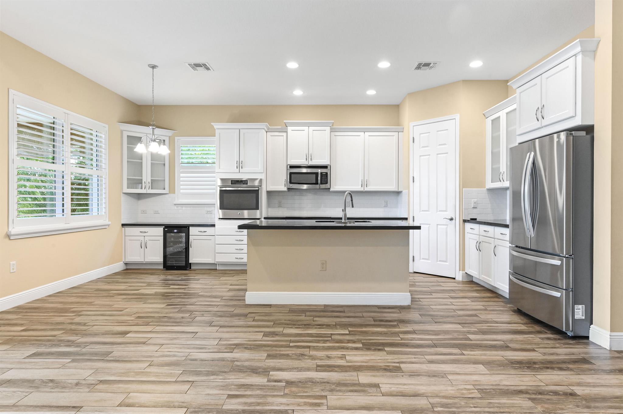 Stunning lakefront gem with a privately fenced yard and oversized screened lanai with picture-perfect water views, boasting 4 beds and 2.5 baths. The home features a massive main bedroom retreat with walk-in closets, formal dining room, and a wide great room that flows into a chef's dream open kitchen. Highlights include an eat-in breakfast nook, black quartz center island, brand new top-of-the-line stainless appliances, triple-door fridge, new induction cooktop paired with a sleek wall oven, temperature-controlled built-in wine storage, complete with white custom cabinetry, and a walk-in pantry. The primary suite is oversized, with an ensuite spa-style bathroom and a huge walk-in shower.