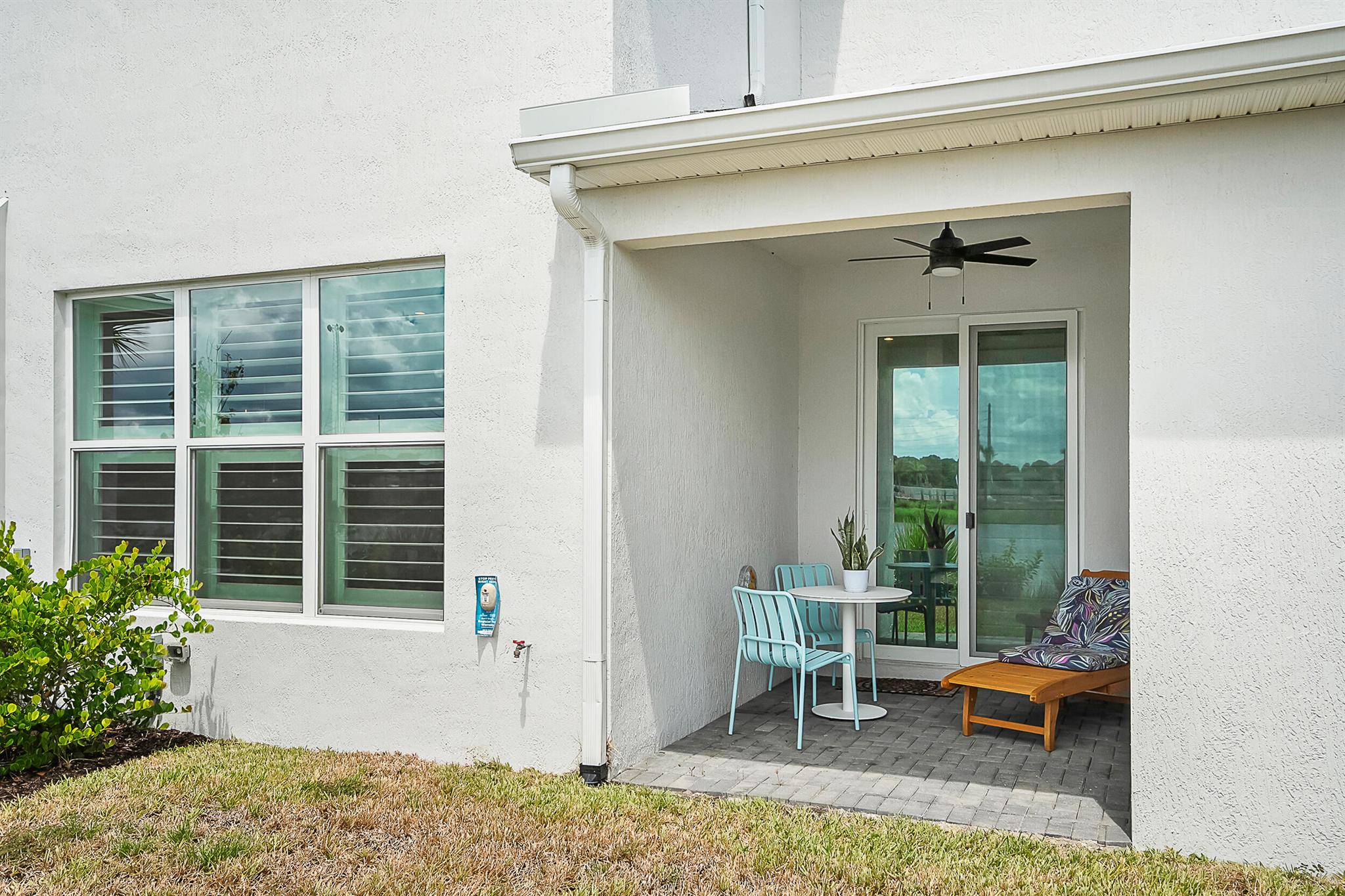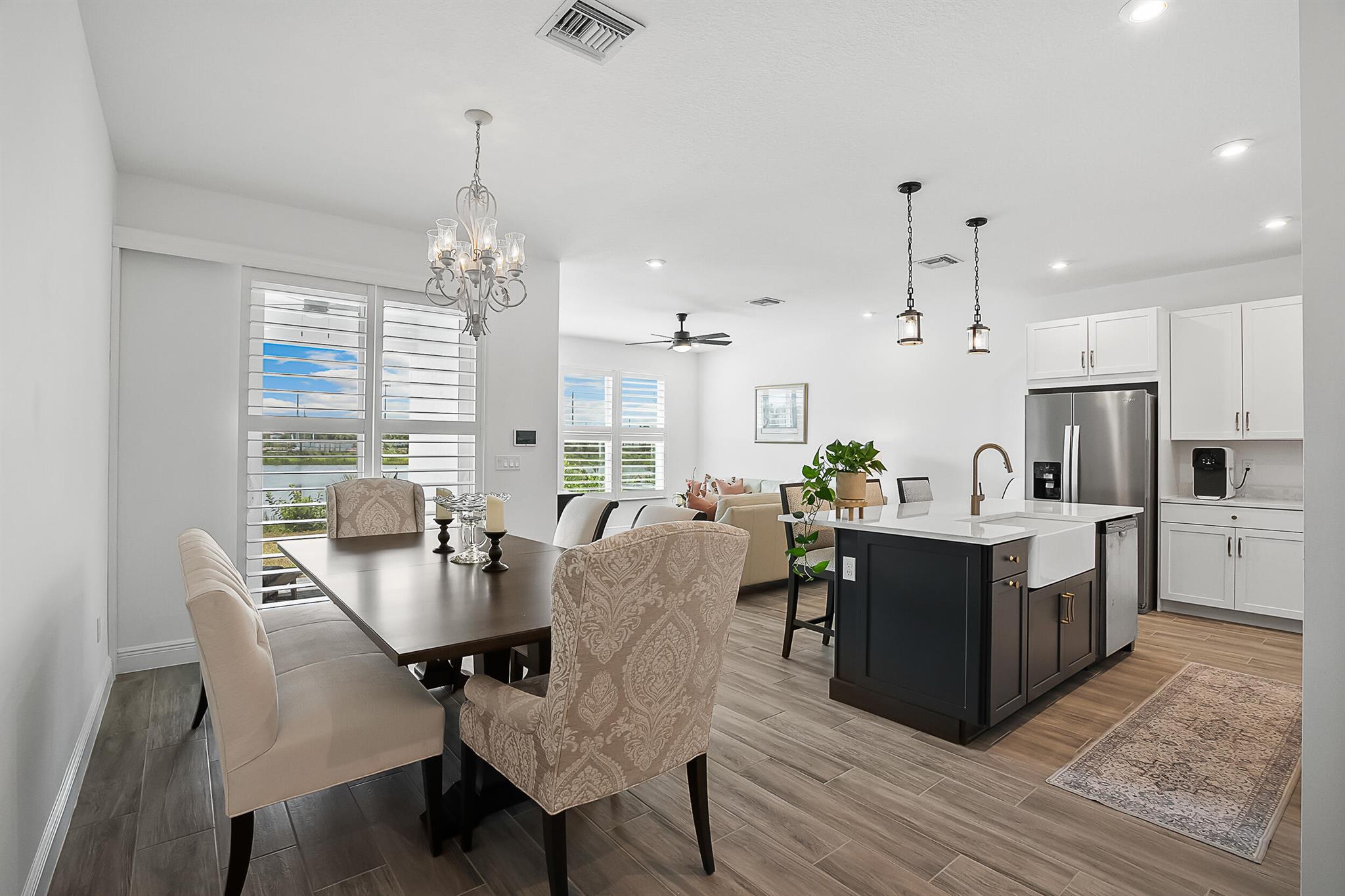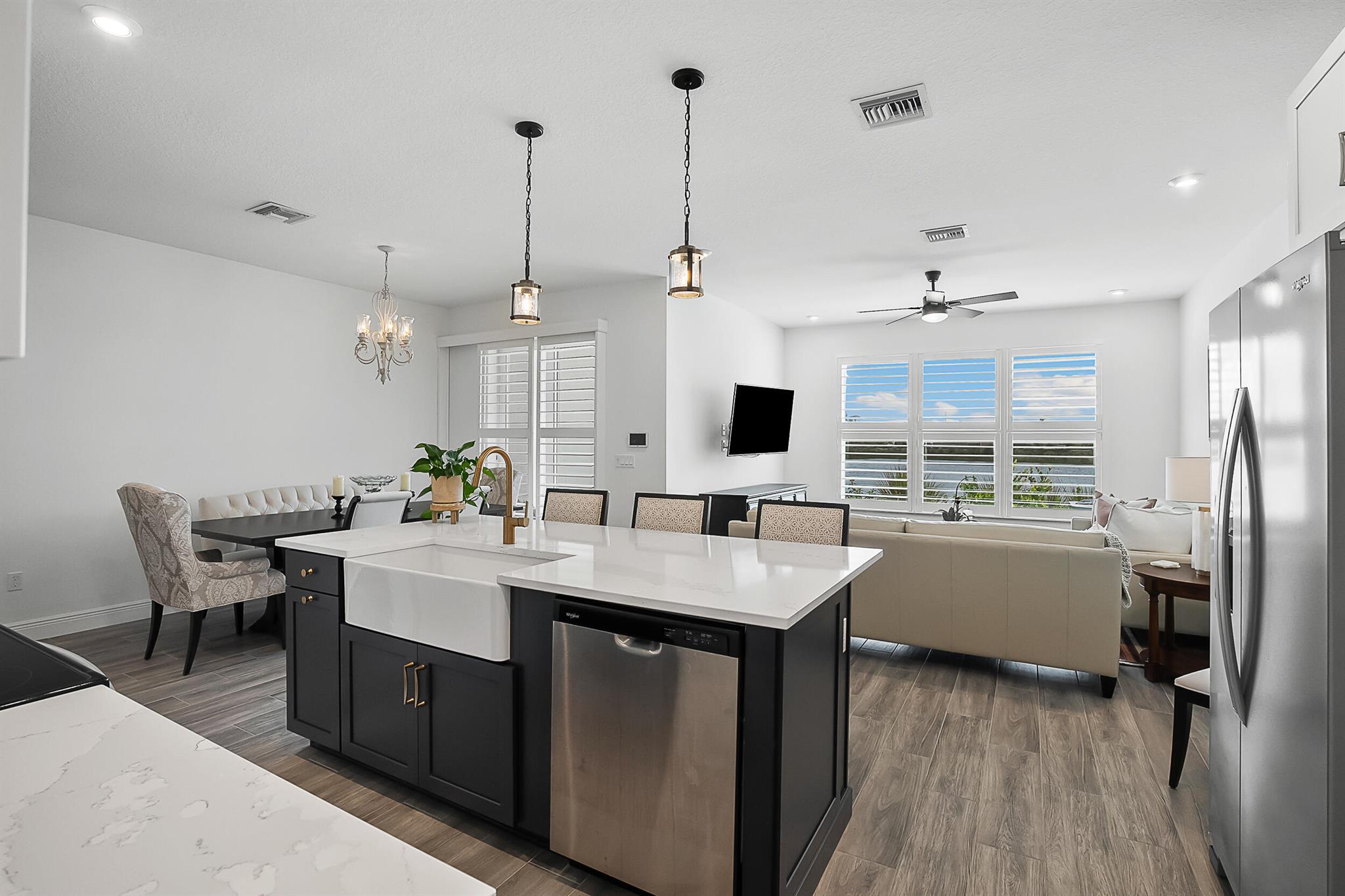 Brand new Dylan floor plan townhome in the heart of Jensen Beach! This 3 bedroom, 2.5 bath, 2-car garage home showcases luxury designer finishes throughout. Enjoy peace of mind with full impact windows, a stylish glass entry door, and elegant stone exterior accents. The gourmet kitchen features 42'' cabinets, quartz countertops, and stainless-steel appliances, while the spacious living area flows seamlessly with luxury tile flooring. Upstairs you'll find a loft and a primary suite with his & her quartz vanities, plus a quartz double vanity in the guest bath. Additional highlights include two-panel interior doors, ceiling fans, and a paver driveway and porch. Relax on your back porch overlooking the serene lake. Ideally located just 10 minutes from Hutchinson Island Beaches.