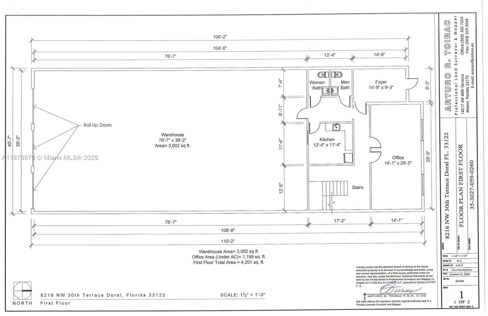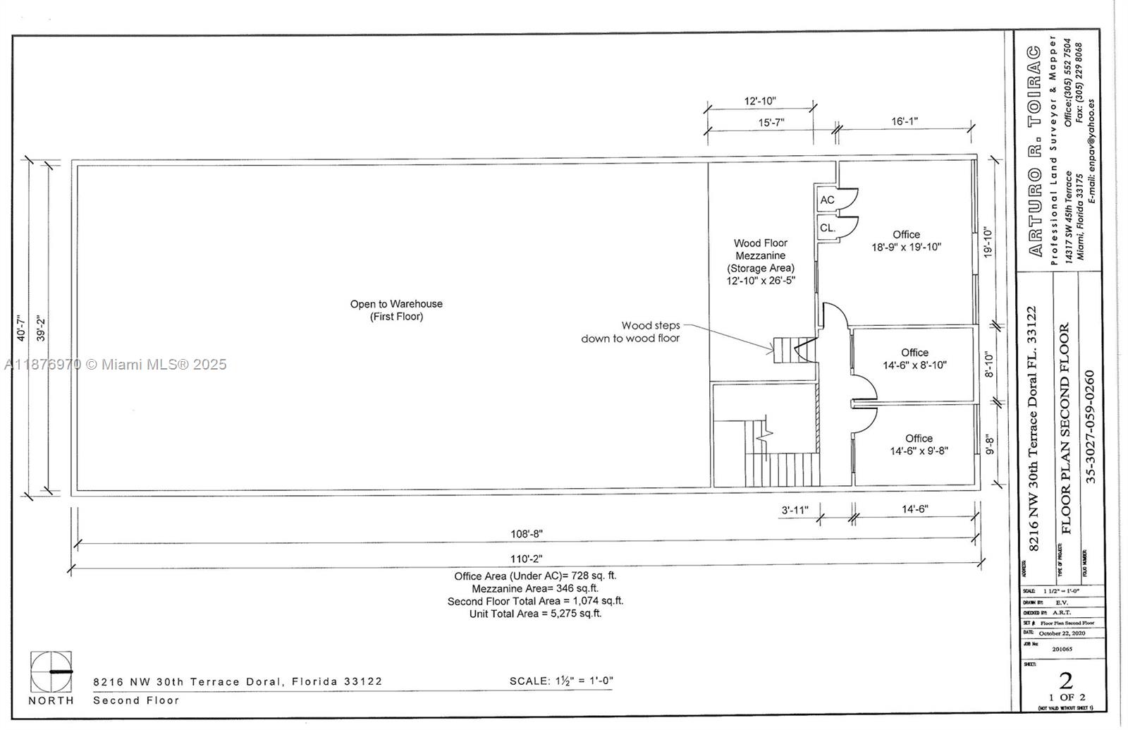 Office /warehouse Combo for Lease (modified gross) in the heart of Doral. Heavy manufacturing permitted. Tax roll reflects 4,390 SF. As per owner's survey, total square footage of unit reflects 5,275 SF. 3 loading doors (1 is a ramp and 2 are truck height), 24 Ft ceiling. Showroom, kitchen/break room, and 2 bathrooms downstairs. 3 private offices upstairs. 10 assigned parking spaces. Tenant to carry insurance on their content/inventory of goods kept in the warehouse. Current lease ends September 30th, 2025.