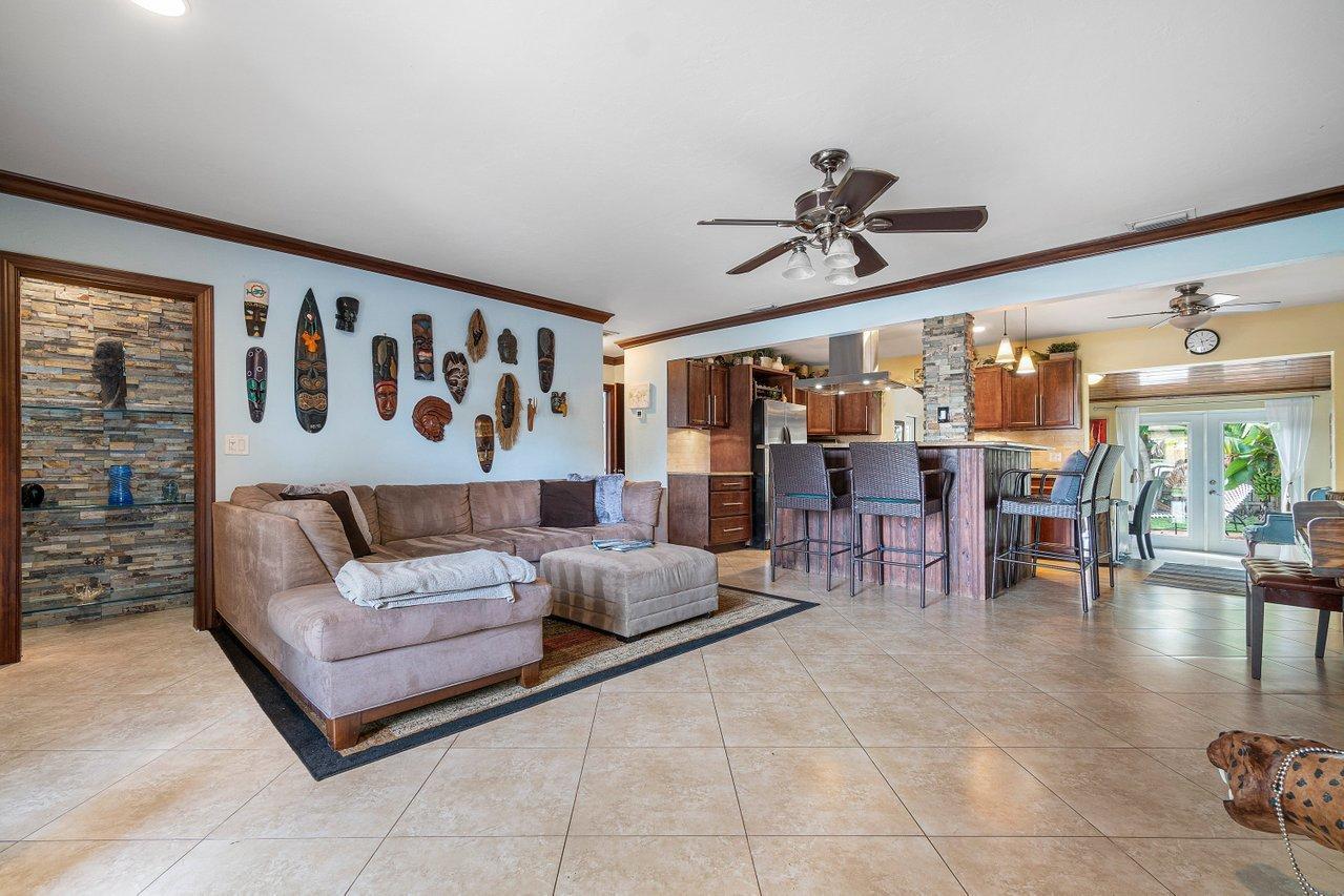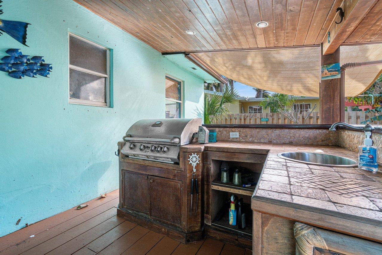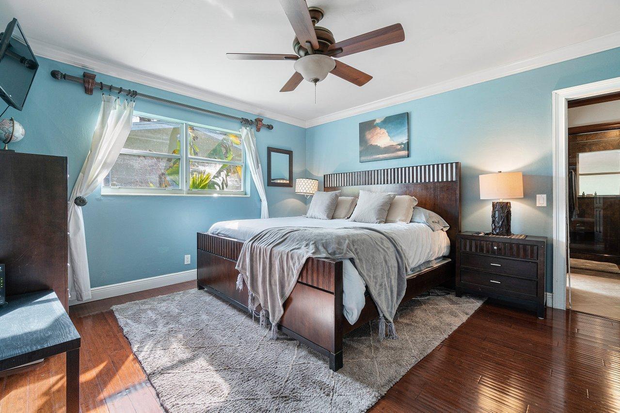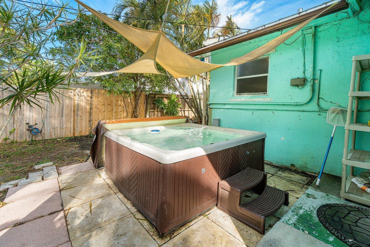 Available Seasonal, Summer, or Annual! New Bathroom install!Just one street from the Intracoastal, this turnkey home offers the perfect mix of tropical style and everyday comfort. An open floor plan creates a welcoming space for entertaining, with a wide, well-appointed kitchen at the center. The master suite exudes a chic island vibe with bamboo wood floors, while the guest room pops with Caribbean blue walls and dark bamboo floors. A third bedroom, bright and airy, doubles as a cozy den with twin beds. The master bath channels the tranquility of a Costa Rican rainforest, while the guest bath reflects timeless Old Florida charm. Step outside to your private backyard oasis--lush tropical landscaping, a spacious deck with resin bar top and grill, and a hot tub for unwinding after a long day