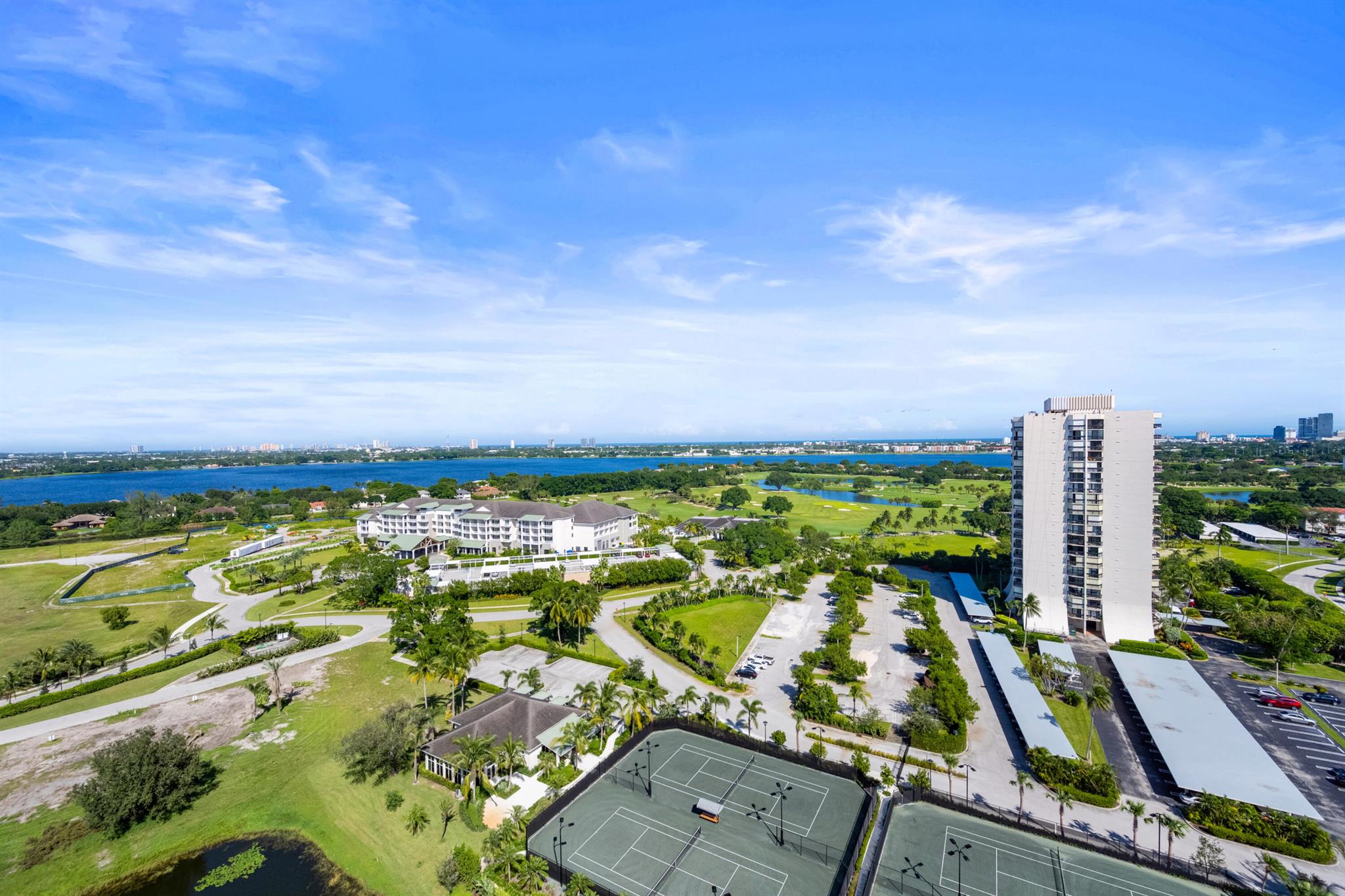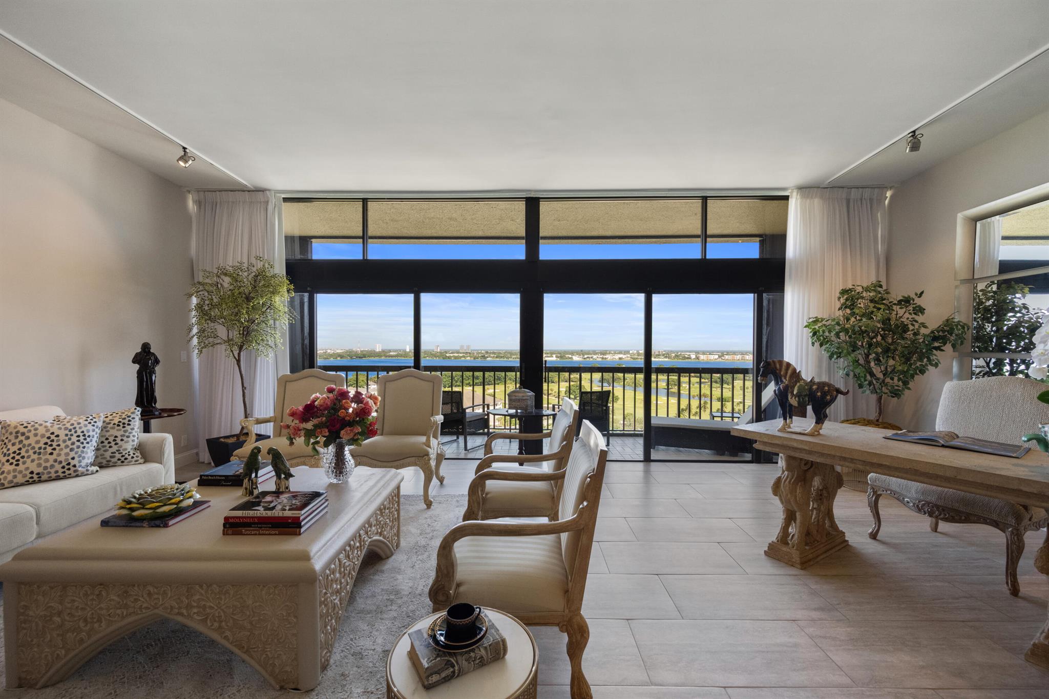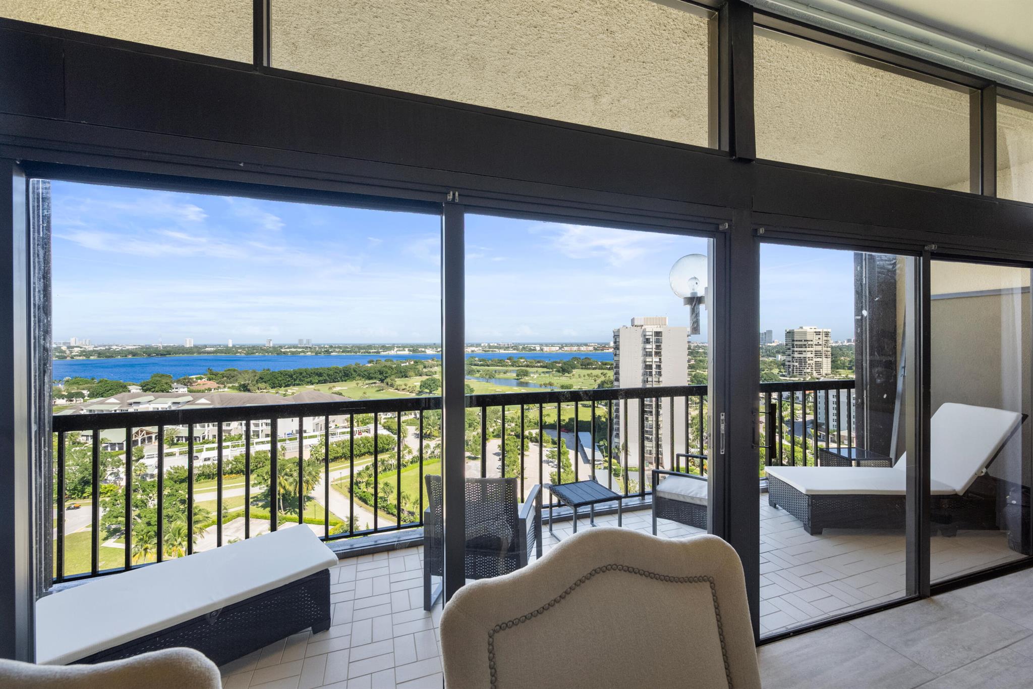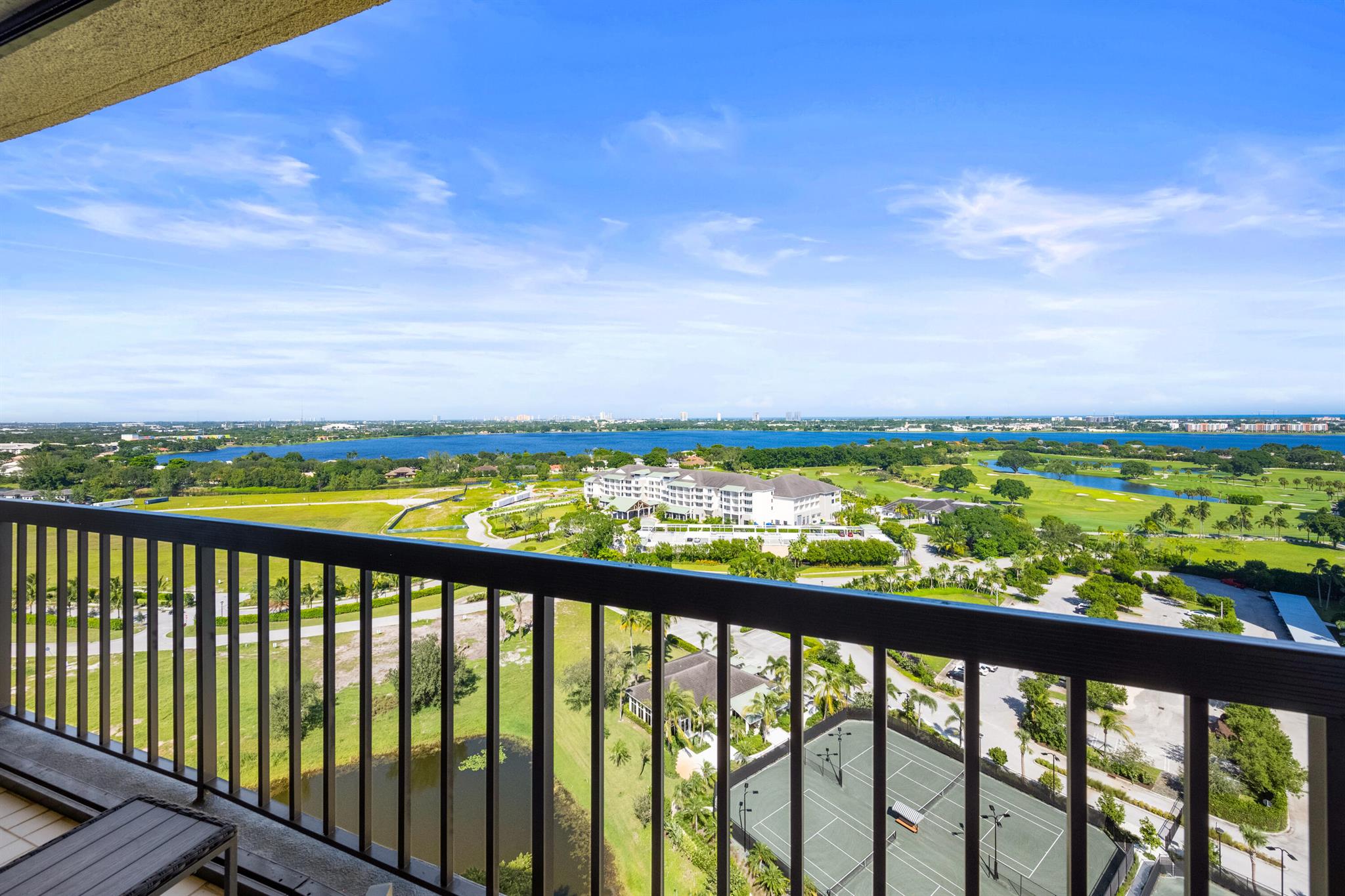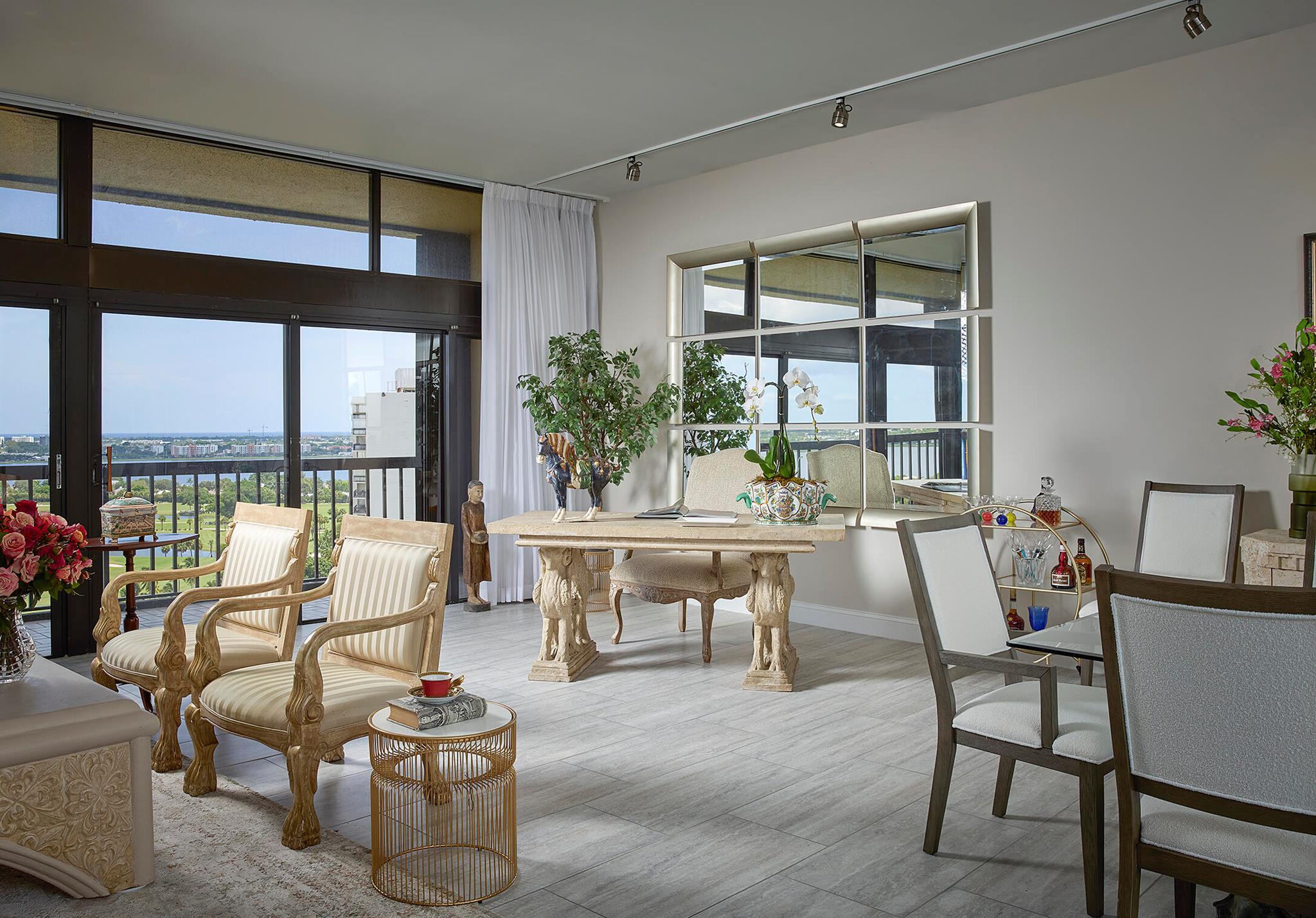 Magnificent lake, golf course and ocean views are the most fabulous features of this spectacular penthouse residence. It offers 10-foot ceilings, floor-to-ceiling windows, two large bedrooms with spacious en-suite bathrooms, an open gourmet kitchen with specimen granite countertops, stainless steel appliances and a kitchen island. This just renovated designer furnished apartment presents a lovely residential experience, a very tranquil space featuring privacy with only four units on the floor.