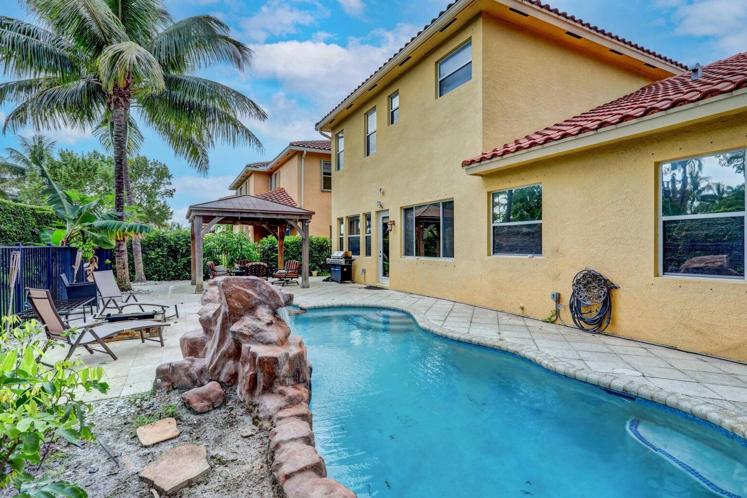 Your Perfect Luxury Home Awaits! Discover a stunning 5-bedroom, 3-bathroom home, loaded with upgrades and designed for sophisticated living. From the gourmet kitchen with sleek stainless steel appliances and granite countertops to the lavish master suite featuring a whirlpool Jacuzzi, ''his & hers'' vanities, and closets, this home offers every modern convenience! Ascend the elegant wrought iron staircase to hardwood floors, or escape to the tropical backyard retreat--completely fenced, featuring a heated pool, gazebo, fire pit, and your very own mango and coconut trees. Located in a prestigious 24-hour guard-gated community, you'll also enjoy top-notch amenities: Perfectly positioned for both work and play.CREDIT SCORE 650+/ 3x income are must per HOA!