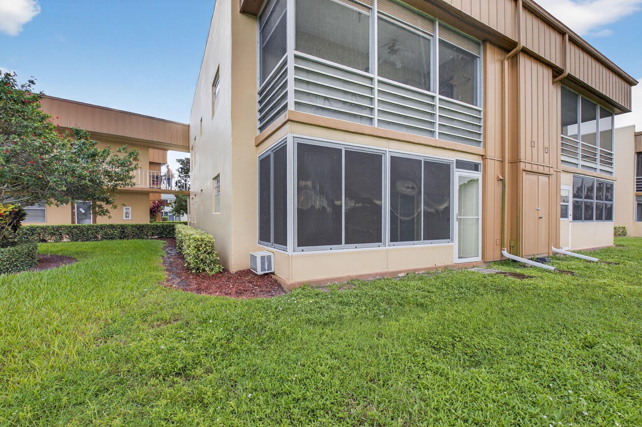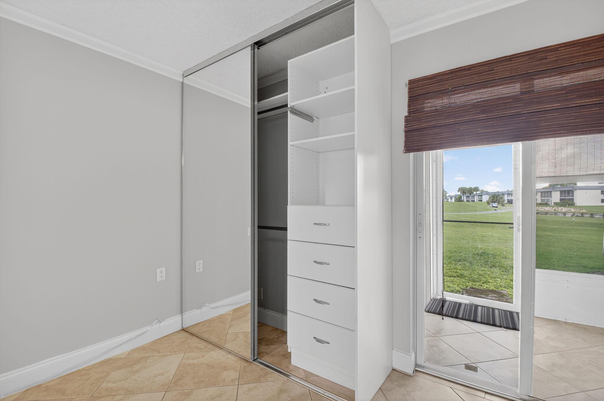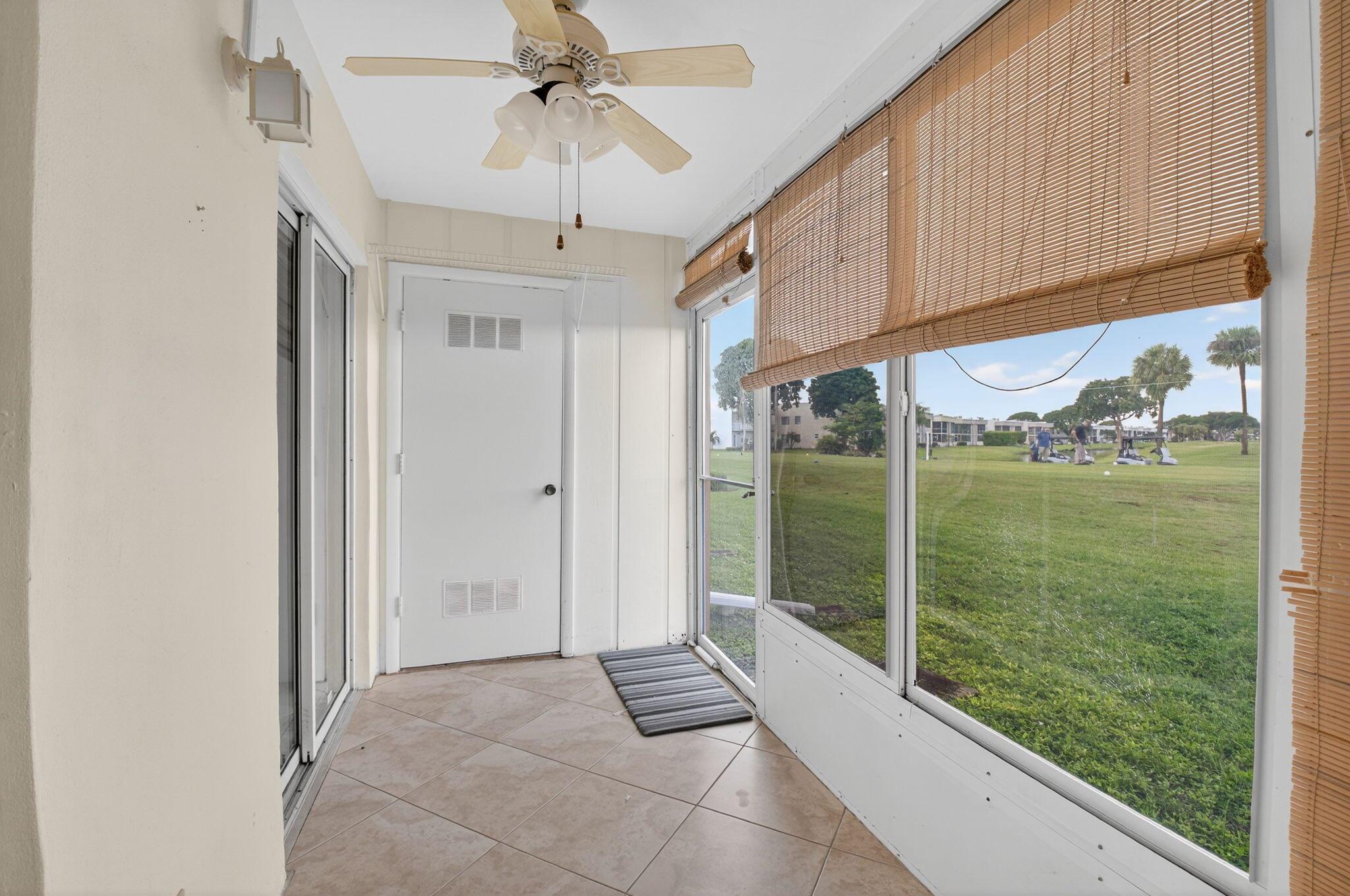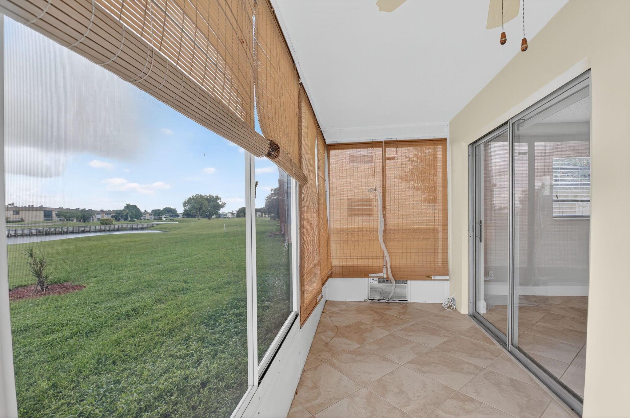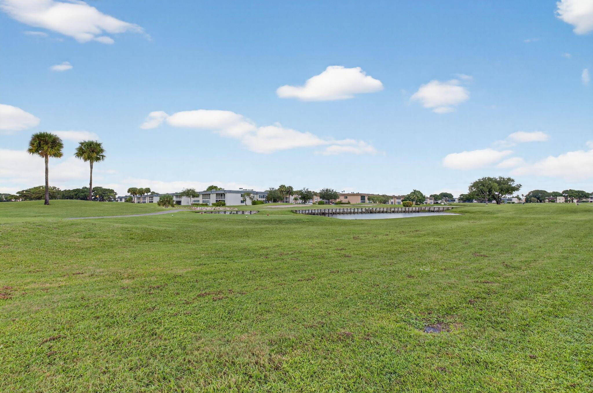FABULOUS GOLF AND WATER VIEW FROM ENCLOSED, AIR CONDITIONED PATIO! First floor lovely condo with upgrades throughout including beautiful open concept kitchen. Extra closet storage with custom shelving in all closets. Full size washer and dryer. Parking space #19 - right by the walkway! Walking distance to the Flanders clubhouse and pool! Close to Linton Avenue gate providing easy driving access. Come enjoy clubs, activities, live shows, movies 2 restaurants and more at very active Kings Point 55+ community.
