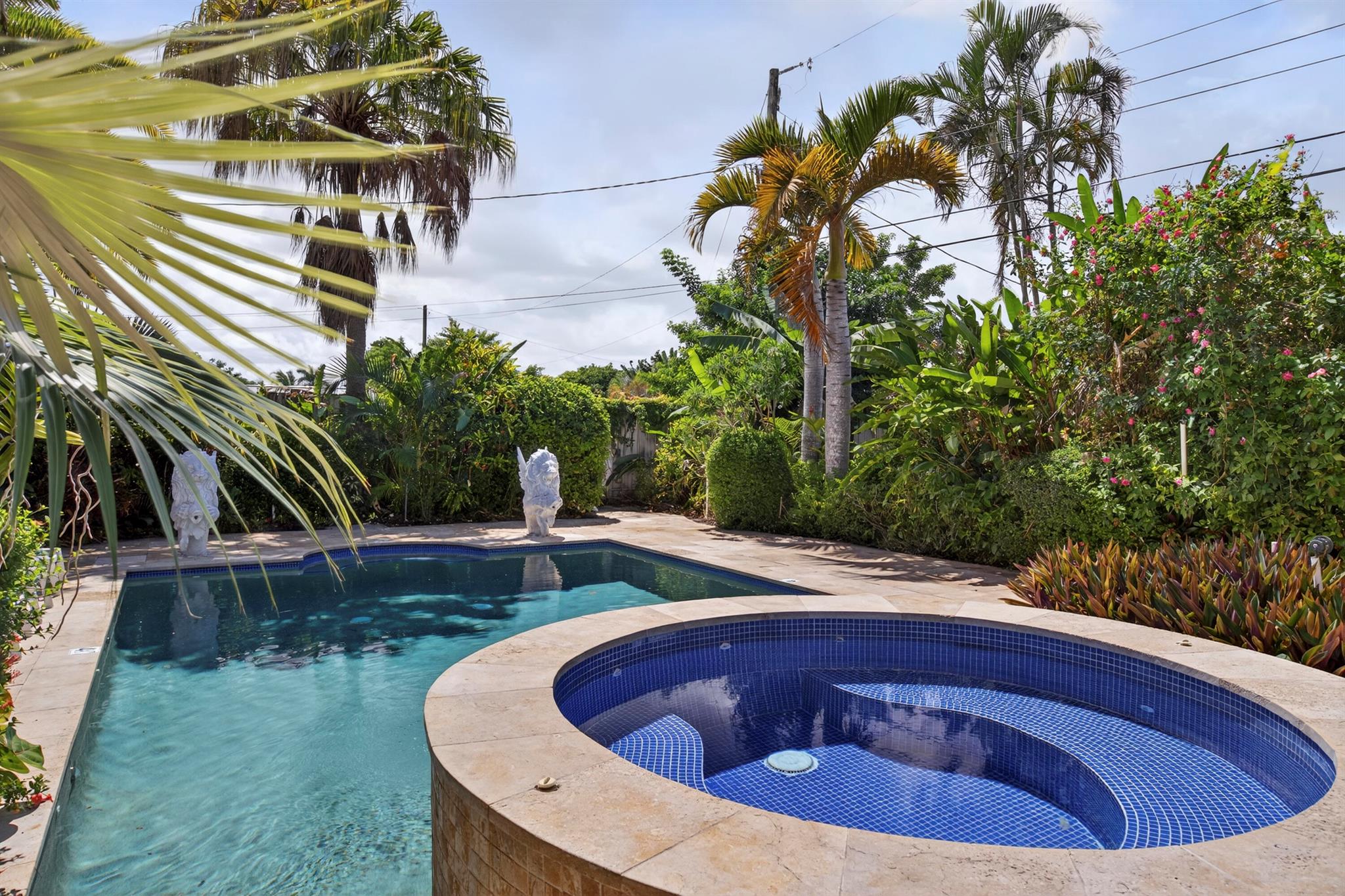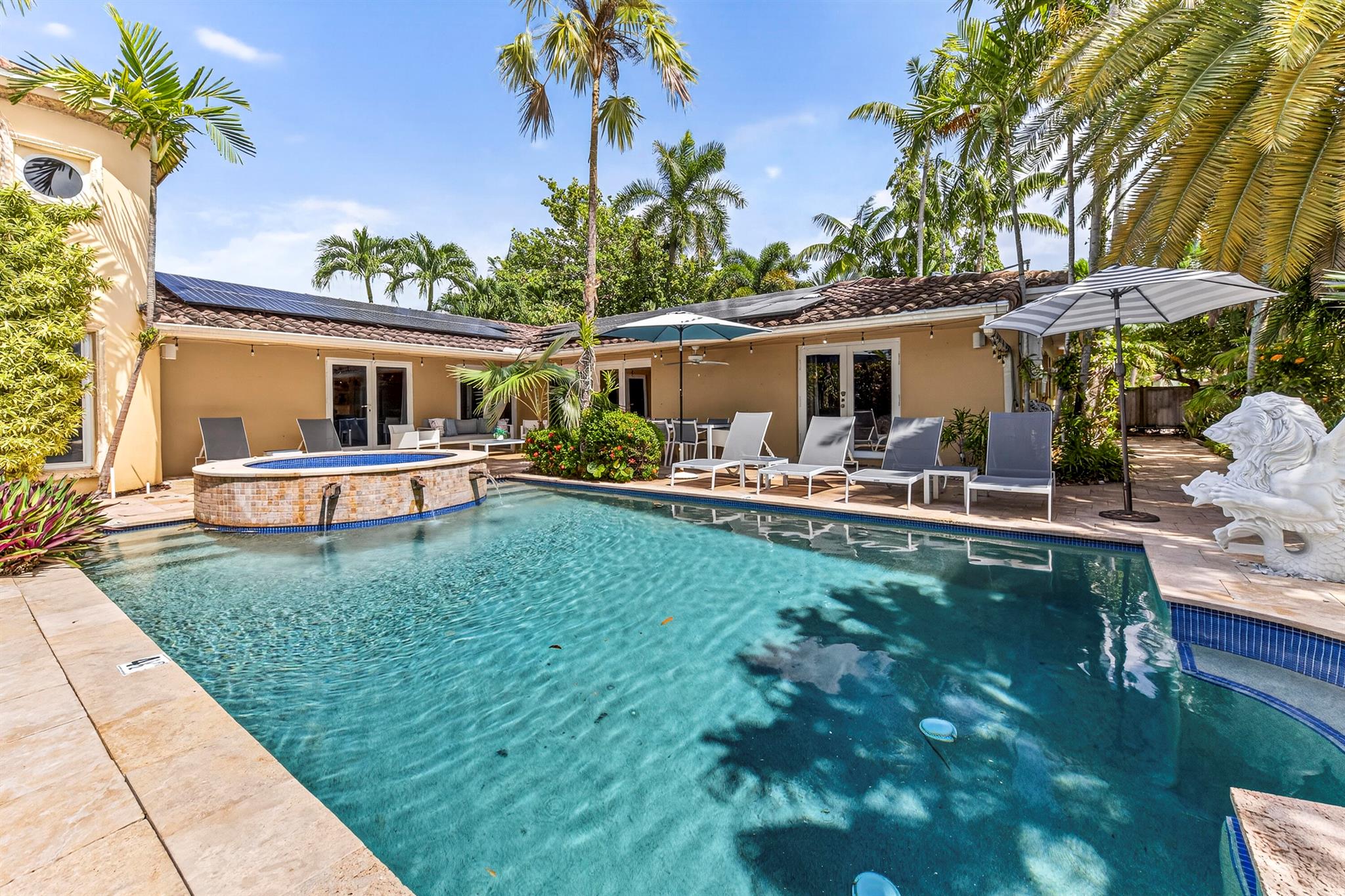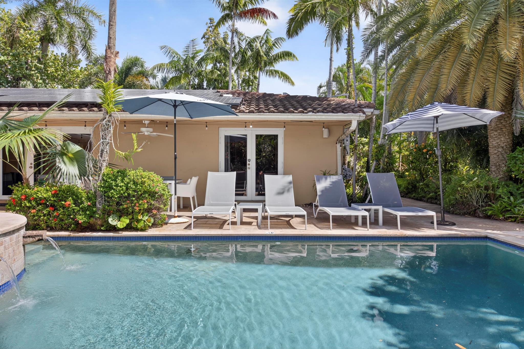 Discover this tropical paradise hidden gem in the heart of Fort Lauderdale. This stylish 4 bedroom, 2 bathroom furnished home features bright, open living spaces, gourmet chef's kitchen, built in closets, and modern finishes. Both bathrooms include walk-in, roll-in showers for comfort, accessibility and a touch of spa like luxury. Enjoy an expansive backyard oasis with sparkling, heated pool, hot tub and extensive outdoor seating, ideal for sun soaked afternoons, evening cocktails or dining under the stars. The front boasts a lush tropical patio with beautiful fountain, creating a serene welcome as well as a wonderful setting for morning coffee or peaceful relaxation. Located minutes from beaches, boating, dining and nightlife, this one captures the best of South Florida living.