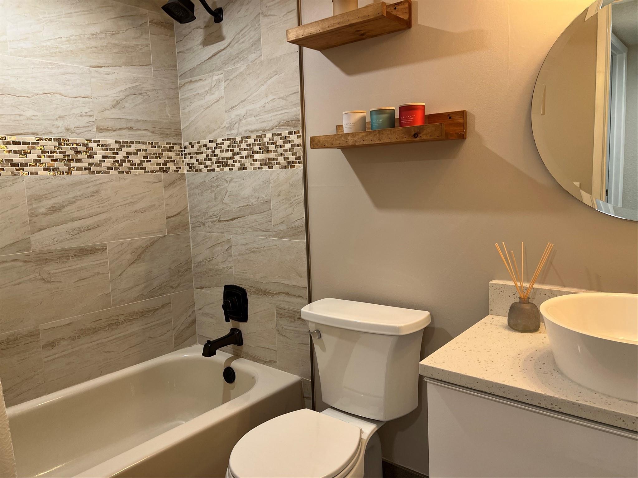 Beautifully renovated 2 bedroom, 2 bathroom condo for rent in Cypress Bend V. Primary bedroom has a large walk-in closet with Alpha System finishes, and a tastefully remodeled bathroom with rain head shower and frameless door. Second room has spacious closet and the second bathroom has a combination tub/shower. Enjoy cooking in this open kitchen with beautiful granite counter tops, newer stainless steel appliances, coffee nook, and pantry with pull out drawers. Tile floors in living areas and high end vinyl in the bedrooms. Enjoy the convenience of a FULL SIZE washer & dryer in the unit. Quiet corner condo with peaceful views of the pool and lake. Complex offers 2 pools, hot tub, gym, tennis courts, clubhouse, car wash area and more. 1 small dog ok with a non-refundable $250 pet deposit.