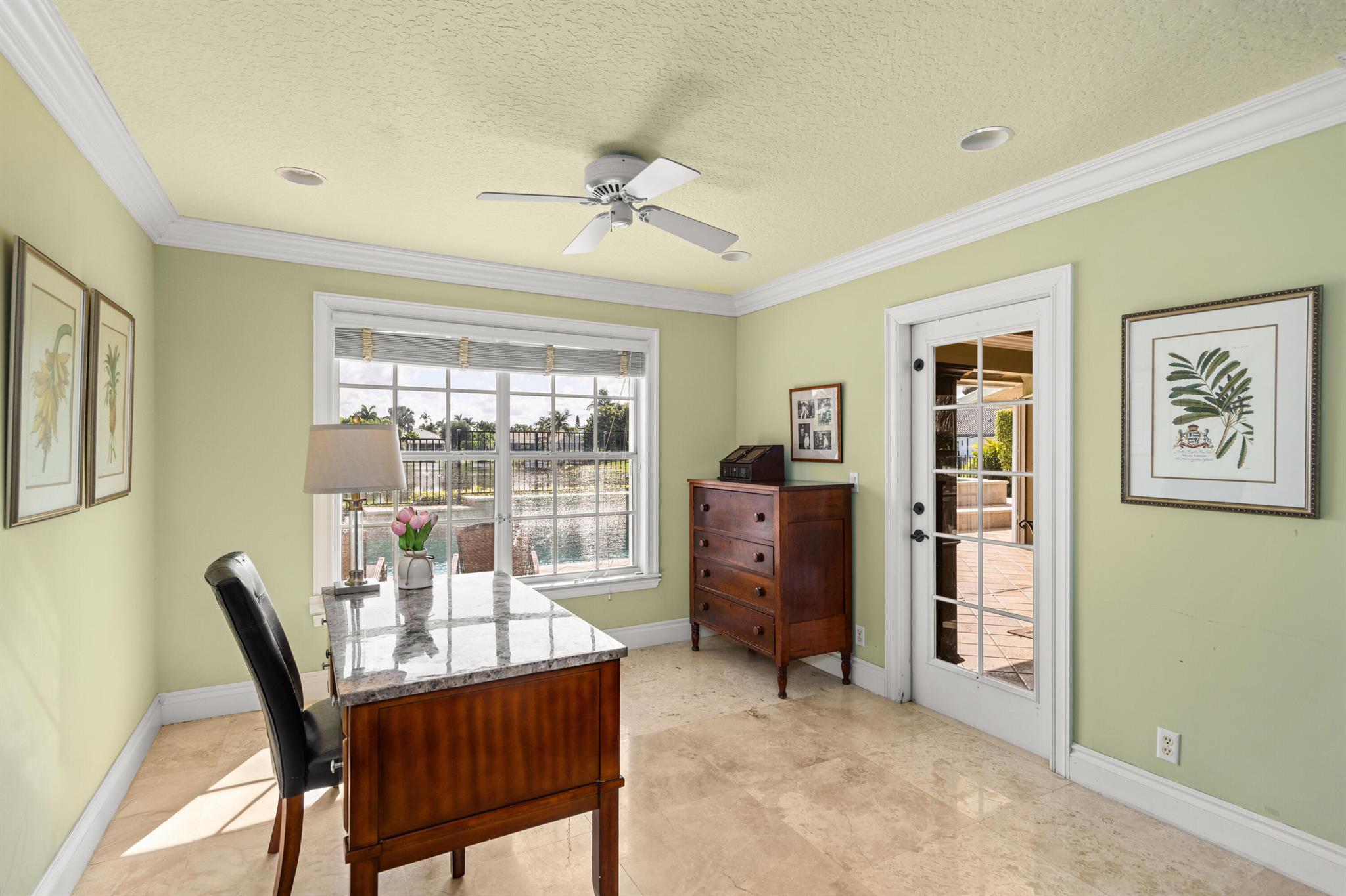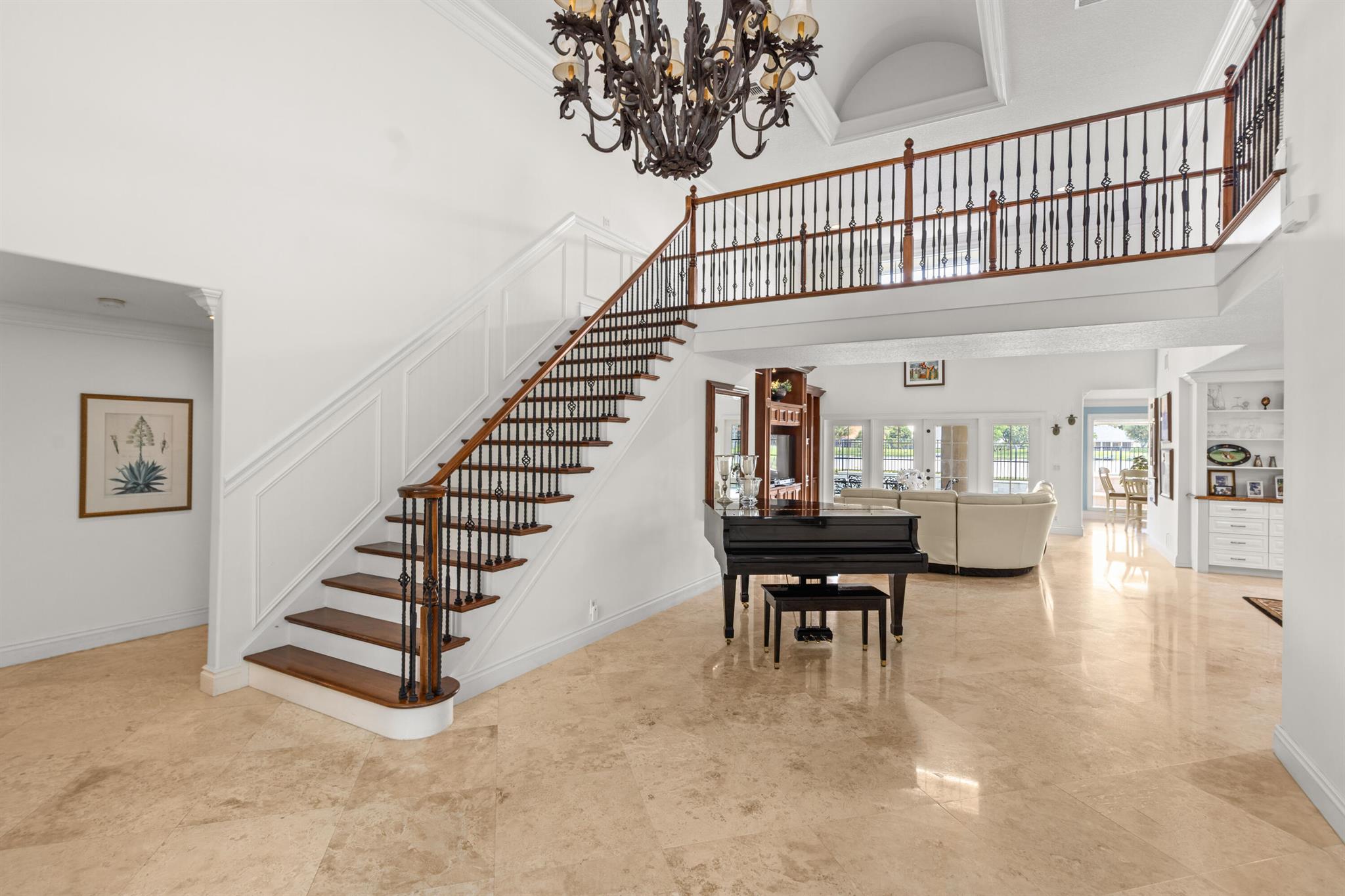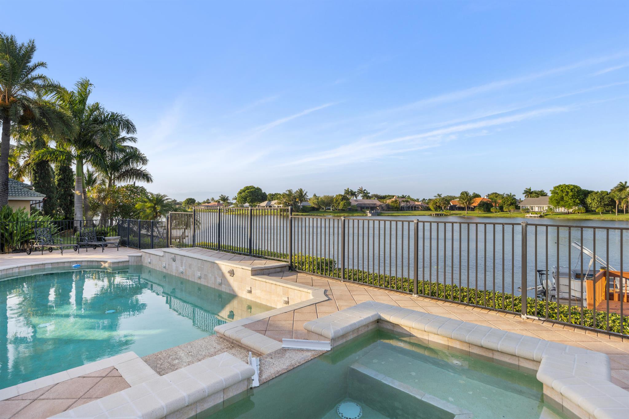 Furnished Seasonal Rental - Enjoy lakefront sunsets from this elegant home in the gated community of Polo West, near Wellington International and Global. Comes with a private dock, 19-ft pontoon boat, and pool table - perfect for waterfront entertaining. Features include double-height ceilings, crown molding, travertine floors, and a spacious first-floor primary suite with Brazilian wood floors and a luxe onyx-accented bath. The gourmet kitchen offers Viking appliances, granite counters, and a breakfast nook with lake views. Upstairs has two bedrooms with a Jack & Jill bath; one guest room is downstairs. Outdoors: covered patio, Tiki bar, summer kitchen, saltwater pool/spa with waterfall. A rare blend of luxury and equestrian living. Some pictures are virtually staged.