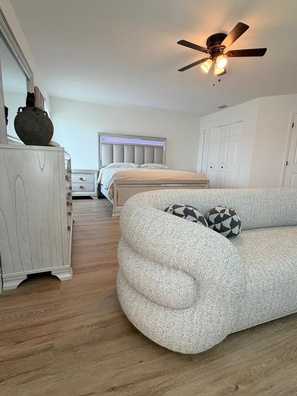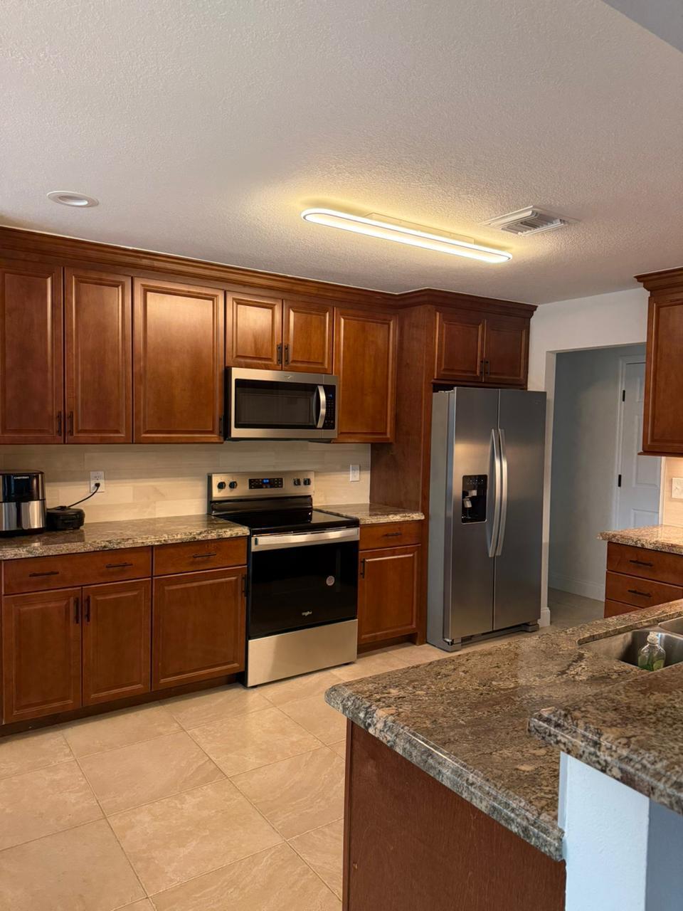 Beautifully renovated Single House with new furniture and appliances. 4 rooms bedrooms(2 King size and 2 Queen size), + 1 Den with Queen size Bed, 3.5 bathrooms, laundry inside. Residence with big pool and yard(The pool extra layer and screen), 2 cars garage, plus golf car available. The community has a private park inside for kids and adults, community amenities include basketball courts and a playground. Bring your client, everyone is Welcome!!!