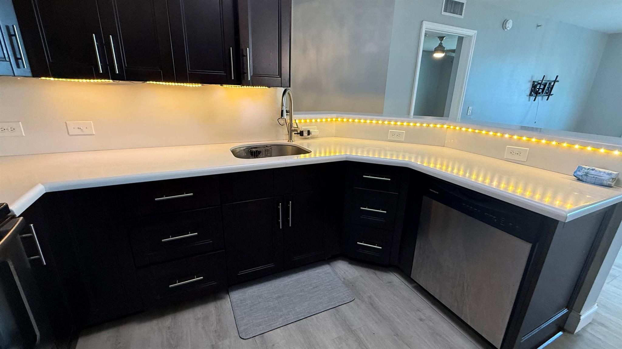 Updated! and stunning , 3-bedroom unit with split floor plan and open kitchen/living style. The kitchen is updated with quartz counters and espresso modern cabinets. Bathrooms have updated cabinets and quartz counters. Hardwood gray floors. This Unite is Located on the 1st floor, and corner unit (iluminated Rents : Basic cable, water, gated and common area (exercise area, clubhouse, pool, spa, grills, sand volleyball, park), and gated entrance. New impact windows, the Building has just been painted and has a new look.