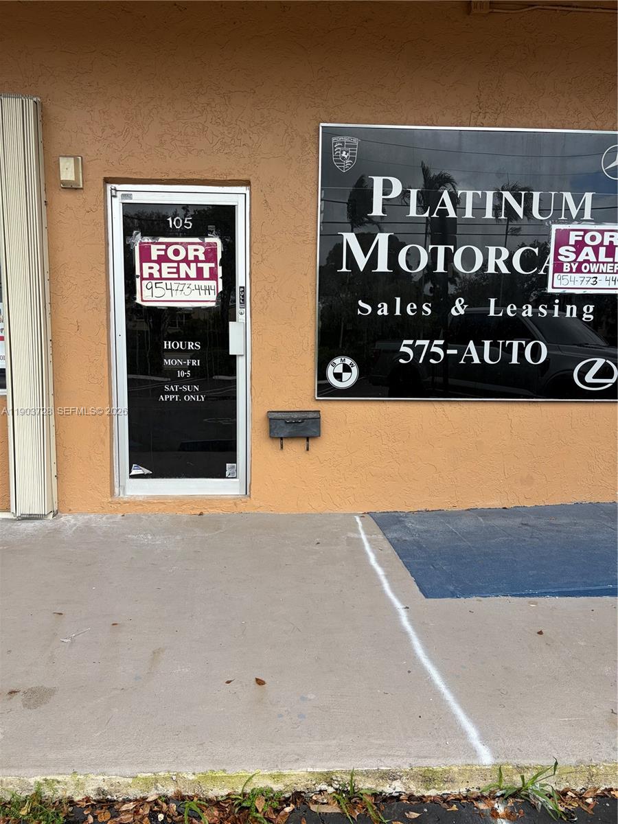 Rarely available 1,100 sf commercial space off Wiles Rd in the heart of Coral Springs. Perfect for location for any type of business. Currently being used as a showroom for car sales and leasing. Unit available for rent December 1, 2025. Lease is $2,500 per month plus cam.