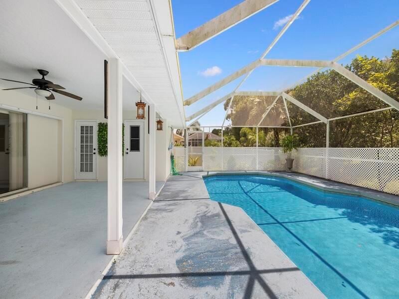 Florida Pool Paradise! Bright, open & move-in ready! NEWER roof, soaring arched ceilings, white tile & wood laminate floors. Re-piped .Triple sliders lead to a sparkling screened pool & private lanai--complete with cabana bath + outdoor shower! Chef's kitchen boasts white cabinetry, modern lighting & pass-through bar. The luxe primary suite features dual sinks, a soaking tub, walk-in closet & private pool access. Washer/dryer included. Fruit and vegetable Trees all around property. This is the one everyone will be talking about--don't miss it!