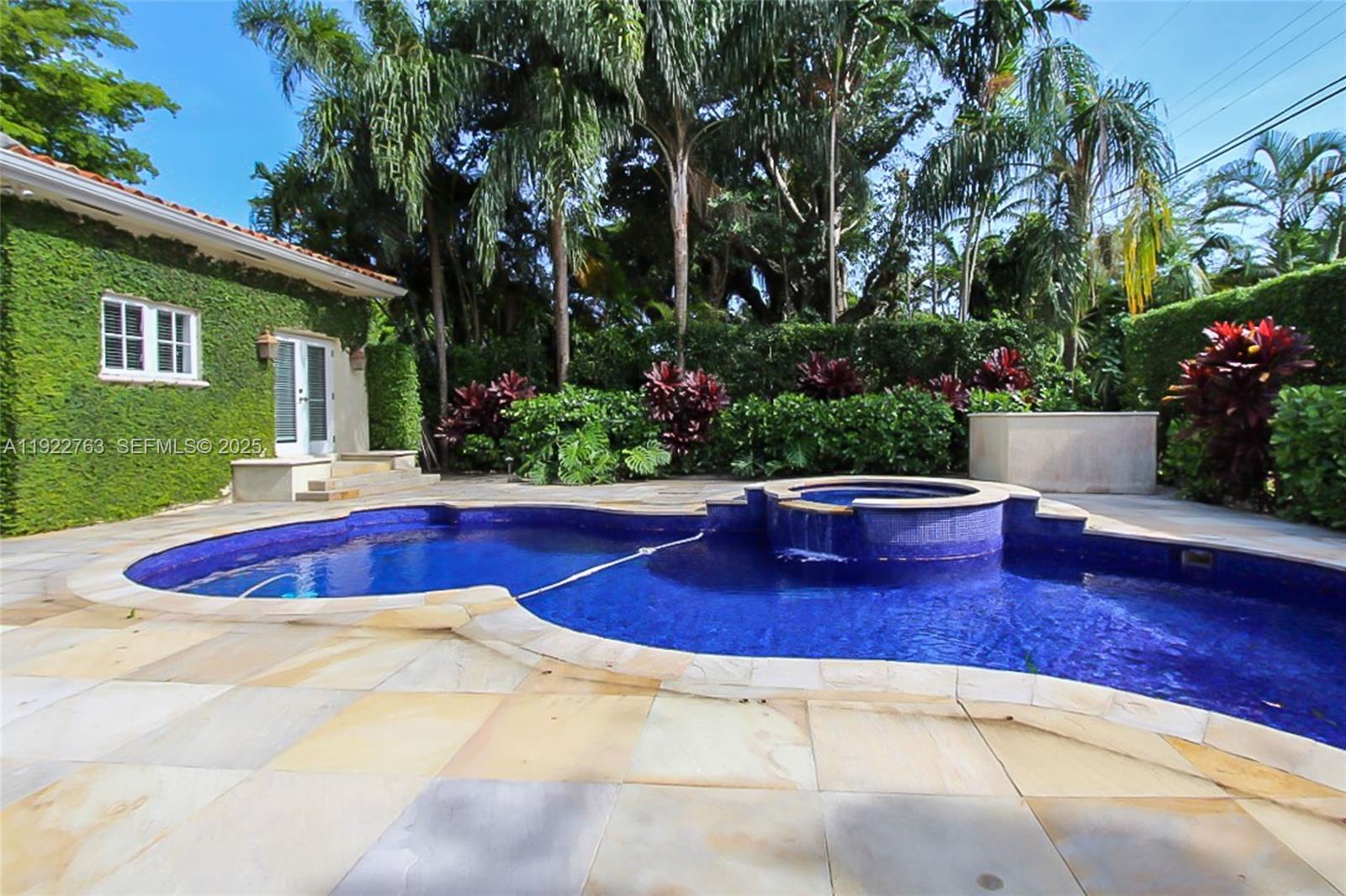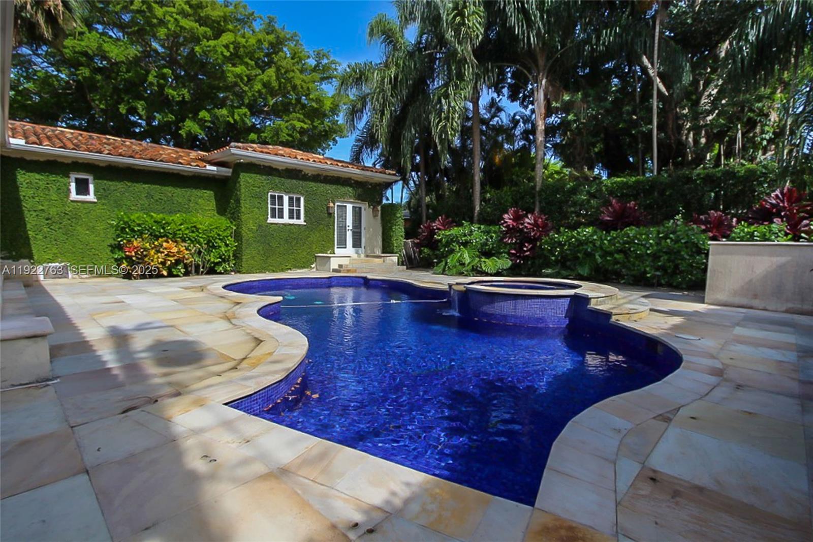 Exclusive corner estate on an oversized 10,800 SqFt lot. Brand-new roof and a striking double-glass pivot entry leading to a double-height foyer with natural limestone floors. Impact glass throughout and exceptional natural light enhanced by a cool, designer palette. Private Primary Suite with His & Hers walk-in closets plus a flexible office/playroom/lounge space. Chef-inspired gas kitchen. 1/1 guest or staff quarters and a spacious family/media room with soaring ceilings. Covered terrace opens to a private, resort-style pool. 1-car garage with covered parking. Quiet, tree-lined street in an exclusive neighborhood.